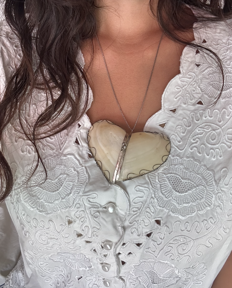 1900년 프랑스 아티스트가 사용했던 마더오브펄(자개) 을 손으로 조각해 하트모양을 만든 앤틱 주얼리 트링켓입니다. 뚜껑에는 은은하게 빛나는 된 하트 장식이 세팅되어 있으며, 작게 열 수 있는 트링켓 기능과 함께 뒷면에는 고리가 달려있어 목걸이로도 착용이 가능합니다. 세월의 흔적이 고스란히 담긴 고급스러운 자개 특유의 질감과, 프랑스 장인의 섬세한 감각이 어우러진 매우 희귀한 소장품입니다.