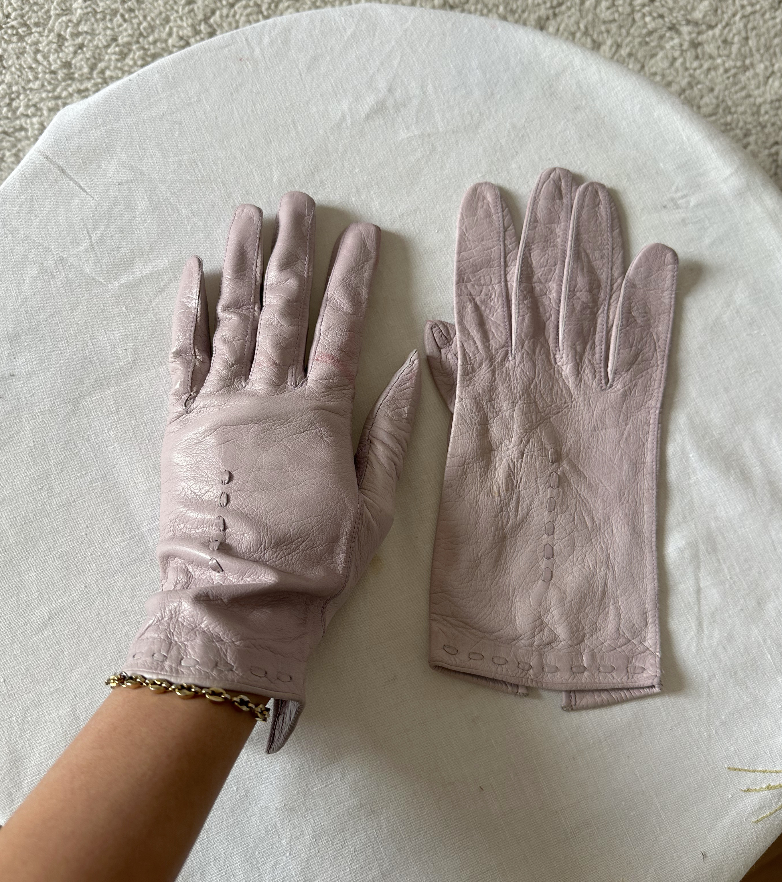 우아한 기품이 느껴지는 이 빈티지 페일 핑크 장갑은 사용해 가죽 공예의 아름다움을 보여줍니다. 부드러움과 견고한 내구성을 바탕으로, 핸드 스티치 디테일은 은은하고 차분한 페일 핑크 컬러는 독보적인 시각적 깊이를 만들어냅니다. 뉴트럴 톤의 빈티지 코트나 격조 있는 이브닝 웨어에 더해져 섬세하면서도 확실한 존재감을 드러냅니다. 뛰어난 통기성과 유연함 덕분에 착용할수록 사용자의 손에 맞춰 길들여지는 편안한 착용감을 자랑하며, 20세기 중반 패션이 지향했던 촉각적 럭셔리와 장인 정신의 숨결을 고스란히 간직하고 있습니다. 제품에 옅은 얼룩들이 보여 그부분 감안하여 가격 조정되었습니다. 빈티지 무드를 가진 디스플레이 오브제로 추천드리는 사랑스러운 제품입니다.