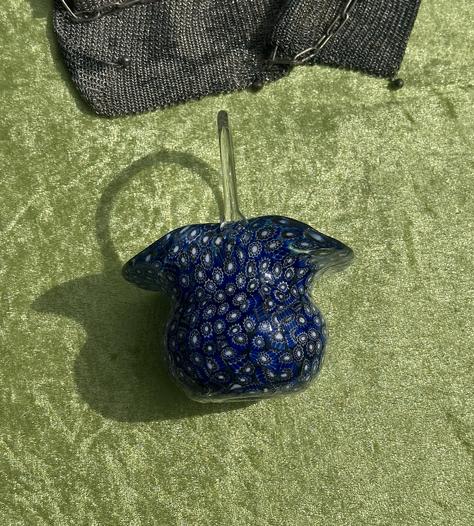 1950년도에 창조된 이탈리아 무라노 Murano 유리 장인 Fratelli Toso가 제작한 밀레피오리 (Millefiori) 글라스 핸들 바스켓입니다. 희소성 높은 무라노에서도 가격대가 높은 화려한 색상의 작은 유리 조각들이 모여 정교한 꽃무늬 패턴을 이루는 밀레피오리 기법으로 제작되어, 장인의 섬세한 손길과 예술성이 돋보이는 아이템입니다. 핸들이 있어 장식용으로도 좋고, 소품을 담아 테이블에 놓으면 화려하고 고급스러운 포인트가 됩니다. 빈티지 컬렉션, 무라노 글라스 애호가들에게 소장 가치가 높은 진귀한 예술품입니다.