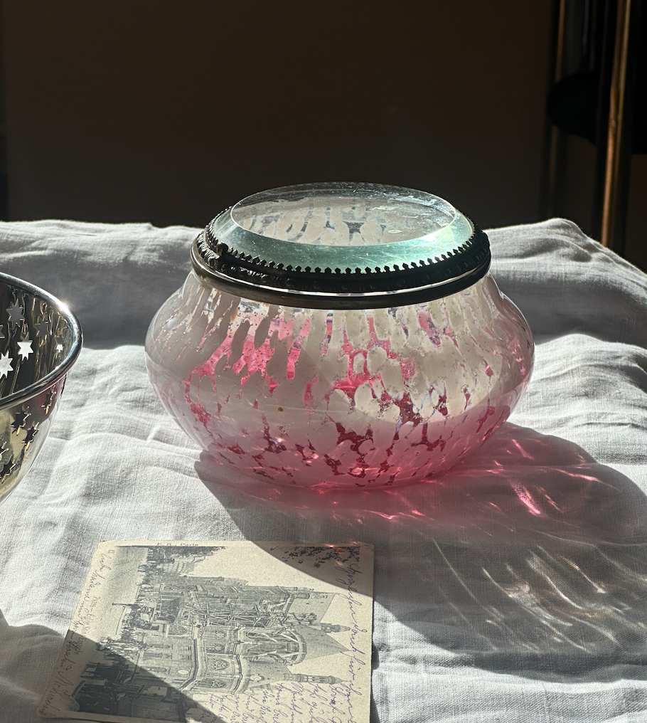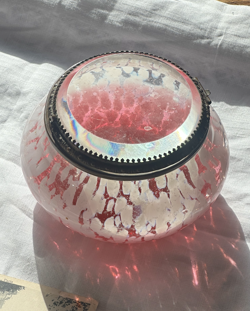 이 박스는 1880년대 글라스의 우아함을 그대로 담고 있는 아주 아름다운 앤틱 파우더/트링켓 박스입니다. 부드럽게 번지는 핑크빛 유리로 손으로 불어 만든 유리가 가진 강렬한 고급스러운 투명이 매력적인 제품입니다. 뚜껑과 바디를 이어주는 브라스로 은은한 핑크 컬러가 빛을 받아 달콤한 사탕처럼 부드럽게 반짝입니다. 그 시절 여성들의 파우더 박스였던 이 작은 용기는 지금은 주얼리 박스, 향수 등 드레서 오브제로도 완벽합니다.