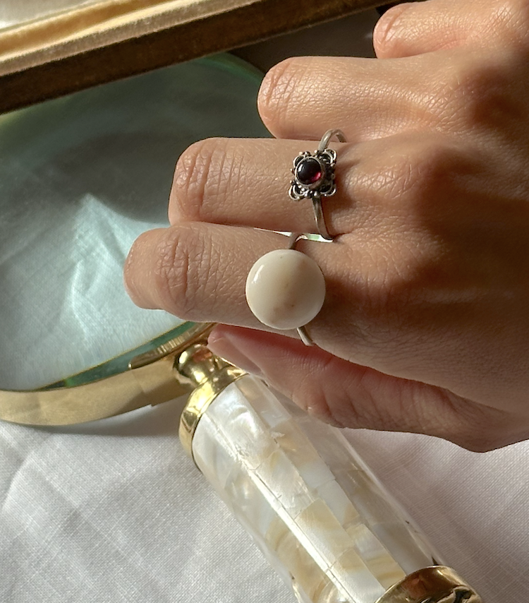 독일의 가장 아끼는 앤틱샵에서 바잉된, 깊은 와인빛 속에 은은한 자주빛이 감도는, 천연 로돌라이트 가닛이 세팅된 클래식한 빈티지 스털링 실버 반지입니다. 이 스톤은 빛을 받을 때마다 붉은색과 보랏빛이 교차하며 부드럽게 반짝여 우아한 모습이고