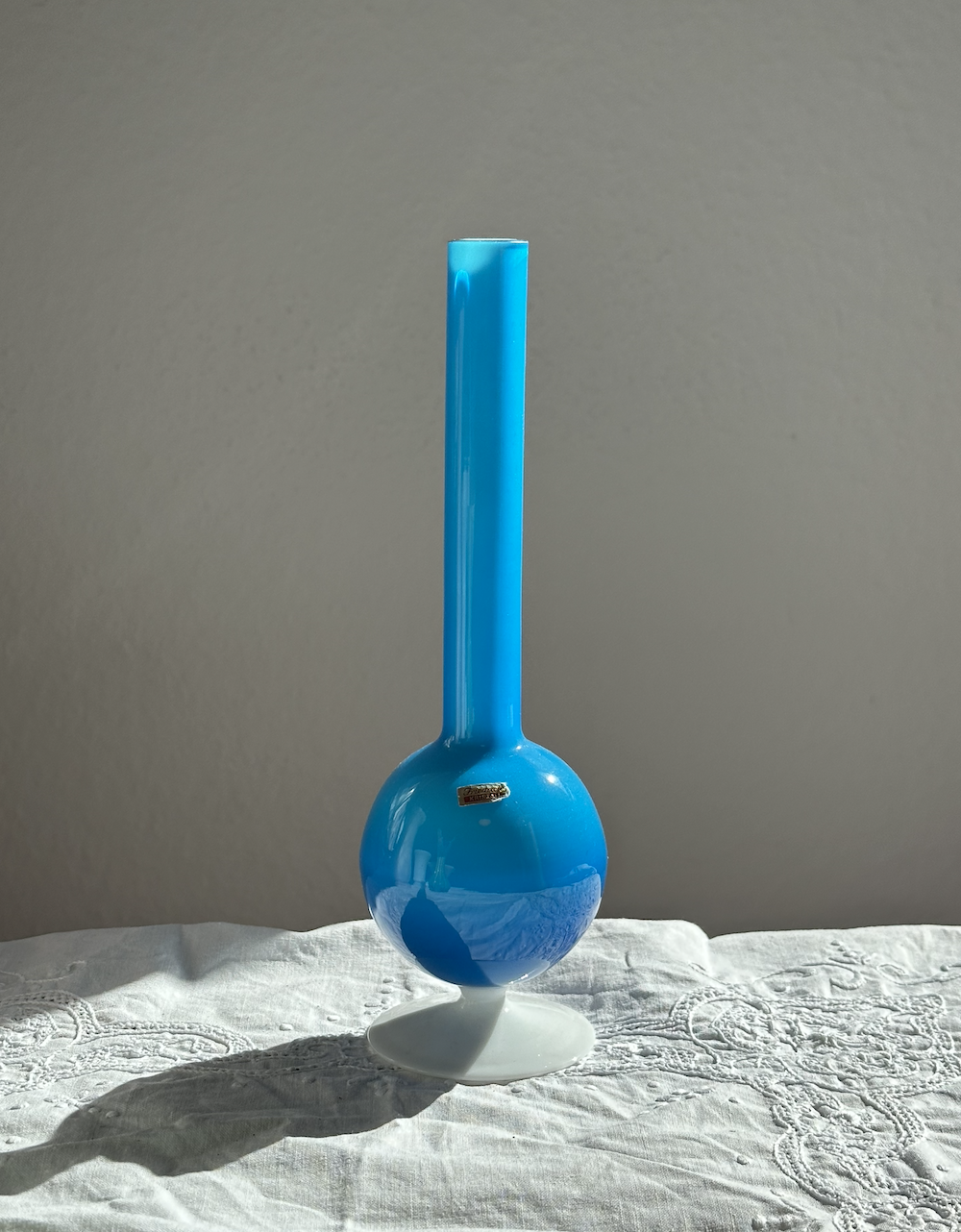 맑고 말간 푸른빛이 돋보이는 이 화병은, 오팔린 글라스 특유의 은은한 유백 광택 위로 번지는 레트로한 블루 컬러가 시선을 사로잡는 빈티지 오브제입니다. 전체적으로 길고 조형적인 바디라인과 볼륨감 있는 귀여운 실루엣이 어우러져, 단독으로 두기만 해도 공간의 포인트가 되어주는 존재감을 지녔습니다. 시 제작사의 오리지널 빈티지 스티커가 그대로 보존되어 있어, 제작 당시의 감성과 진정한 빈티지의 흔적을 고스란히 느낄 수 있습니다. 민트 컨디션으로 보존되었습니다.