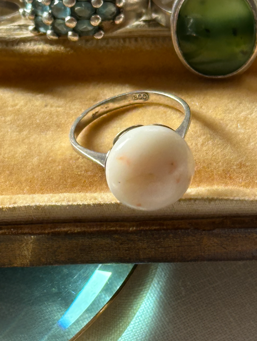 독일에서 가장 아끼는 앤틱샵에서 바잉된, 부드럽고 맑은 빛의 천연 산호, 마치 새벽의 안개빛처럼 은은한 화이트 코랄이 아름다운 빈티지 실버 800 반지입니다. 실버는 고전적인 두께감과 함께 시간이 만들어낸 따뜻한 윤기를 품고 있어요. 둥근 카보숑 컷의 산호가 손끝 위에서 고요하게 빛을 머금은 듯한 디자인입니다. 코랄을 자세히 보면 핑크빛의 점들과 선으로 우아하고 여성스러운 매력에 자꾸만 시선이 가는 제품입니다.