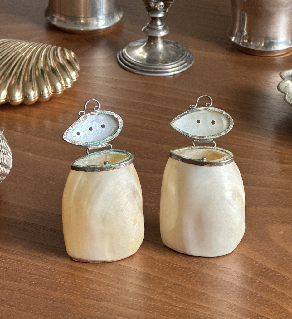 우아한 자개 광택이 돋보이는 앤틱 마더 오브 펄 솔트 & 페퍼 셰이커 세트로, 세월이 만들어낸 은은한 빛과 정교한 수공예 디테일이 아름답게 어우러진 작품입니다. 천연 자개의 오로라 같은 반사빛이 각도에 따라 부드럽게 변화하며, 테이블 위에 두기만 해도 품격 있는 분위기를 연출합니다. 고급스러운 실버 디테일과 섬세한 곡선 라인이 조화를 이루어, 단순한 식탁 소품을 넘어 하나의 장식 오브제로 손색이 없습니다. 19세기 말~20세기 초 유럽에서 제작된 희귀한 앤틱 세트로, 수집가와 클래식 테이블웨어 애호가 모두에게 소장가치가 높은 레어 피스입니다.