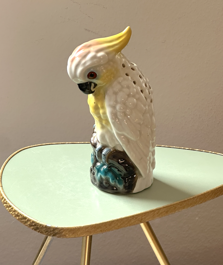 이 제품은 독일의 1940~1960년대에 유행했던 빈티지 코카투 (앵무새) 포셀린 오브제 입니다. 당시 유럽에서는 TV 위를 장식하는 작은 포셀린들이 인테리어 포인트로 크게 사랑받았어요. 앵무새의 부드러운 윤곽과 유약의 은근한 광택감과 따뜻하고 낭만적인 그림자감이 공간 전체에 조용한 열대풍 레트로 무드를 만들어줍니다. 이제는 동물 포셀린이 이와같은 기술로 만들어지지않아 희소성이 높은만큼 가격도 높답니다. 핸드메이드로 만들어진 아름다운 색을 가진 앵무새로 공간에 유니크한 디스플레이를 해보세요.