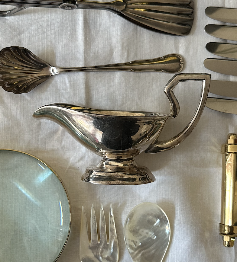 이 제품은 우아한 라인의 실버 컬러 스테인리스 그레이비 보트 오브제입니다. 그레이비 보트는 원래 소스나 그레이비를 담아 식탁에 올리는 용도로 사용되는 테이블웨어지만, 집에서는 플라워 베이스, 인센스 홀더, 주얼리 트레이 등으로도 감각적으로 활용할 수 있습니다. 은은한 실버 컬러와 클래식한 손잡이 라인이 함께 어우러져, 식탁 위에 두었을 때나 선반 위 오브제로 놓아두었을 때 빈티지 특유의 고급스러움이 표현됩니다.