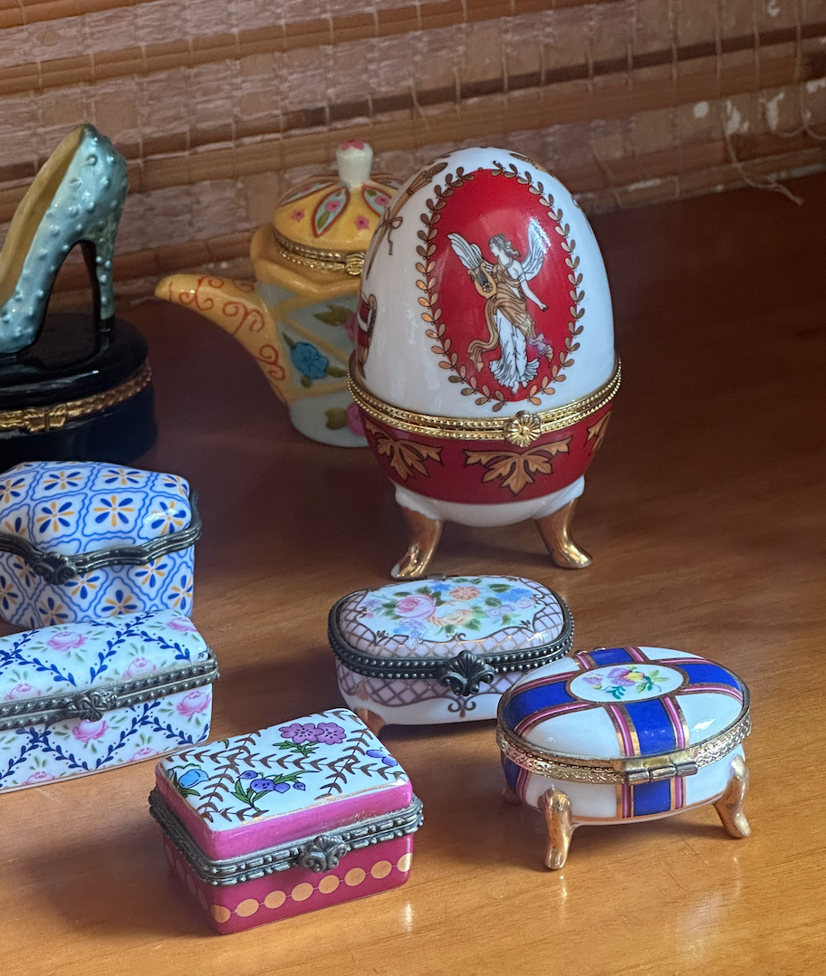 아름다운 천사와 그리스 신화적인 요소가 어우려져 고풍스러운 분위기를 자아내는 매력적인 깊은 레드 주얼리함입니다. 골드와 레드의 색상 조합은 왕실의 품격을 연상시키며, 빈티지한 매력 또한 더해줍니다. 코스튬 주얼리나 반지, 작은 소품을 보관하기에 적합한 보석함 또는 약통입니다. 계란모양의 우아한 타원형 디자인으로, 손에 잡기 편안하고 아름다운 곡선미를 가지고 있습니다. 이러한 형태는 시각적으로도 매력적이며, 클래식한 느낌을 더해줍니다. 소형 사이즈로 여행 시에도 휴대하기 좋으며, 주얼리나 소품을 안전하게 보관할 수 있습니다. 침실의 화장대나 거실의 장식장에 놓아 클래식하고 우아한 분위기를 연출할 수 있습니다. 왼쪽 발 한쪽 앞부분의 골드의 탈락이 아주 살짝 보입니다.