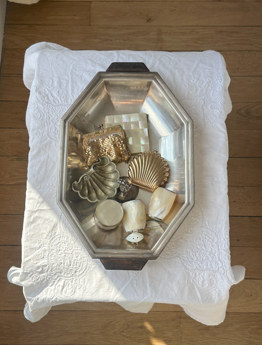 1930년대 제작된 아르데코 스타일 실버 플레이트의 브레드 바스켓으로, 유려한 곡선과 기하학적인 라인이 조화를 이루는 세련된 디자인이 특징입니다. 은은한 광택의 실버 메탈 바디에 따뜻한 색감의 우드 핸들이 더해져, 금속의 차가움과 자연스러운 질감이 완벽하게 어우러진 작품입니다. 테이블 위에 놓으면 시대의 품격이 느껴지며, 빵이나 과일을 담는 실용적인 용도는 물론, 인테리어 오브제로도 존재감이 확실한 아이템입니다. 1930년대 특유의 아르데코 감성이 잘 담긴 희소한 빈티지 바스켓으로, 소장가치와 실용성을 동시에 갖춘 고급스러운 컬렉터 피스입니다. 생활의 스크래치들이 보이지만 자연스러운 멋이 보이는 빈티지 컨디션으로 보존되었습니다.