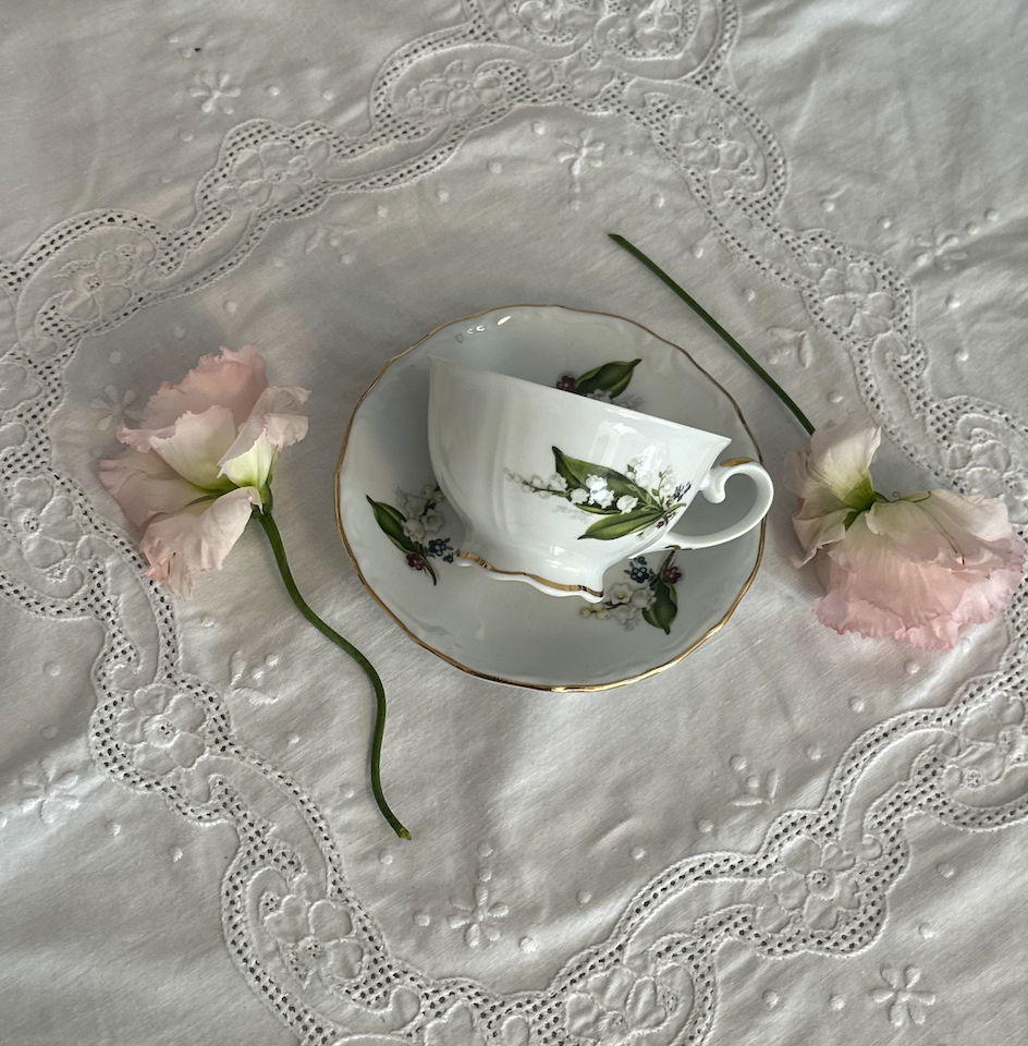 세라믹으로 유명한 독일의 도시 바바리아에서 제작된 청초한 매력이 가득한 은방울꽃이 섬세하게 그려진 찻잔과 소서 세트입니다. 작고 하얀 종 모양의 은방울꽃은 순수, 겸손, 행복의 재회를 상징하며, 유럽에서는 5월의 꽃으로 사랑받아 왔습니다.