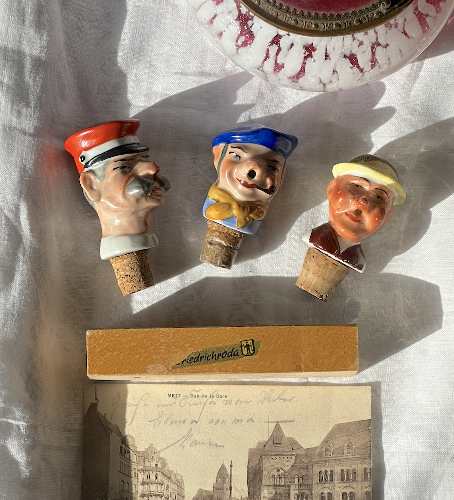 독일에서 1930년도에 제작된 빈티지 포슬린 병마개 3종 세트입니다. 모두 핸드메이드와 핸드페인트로 만들어진 유니크하며 사랑스러운 모습입니다. 윗부분은 수공으로 채색된 포셀린이고, 아래는 코르크로 만들어져 와인병, 식초병, 오일병 등에 사용할 수 있습니다. 각각의 얼굴 표정과 컬러감이 달라 셋이 함께 놓이면 작은 오브제 컬렉션처럼 연출됩니다. 주방 선반, 바 카트, 찬장 위에 두기만 해도