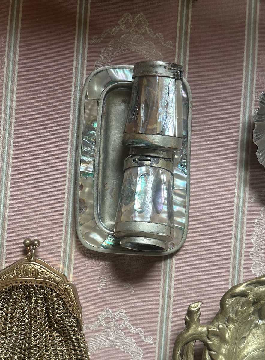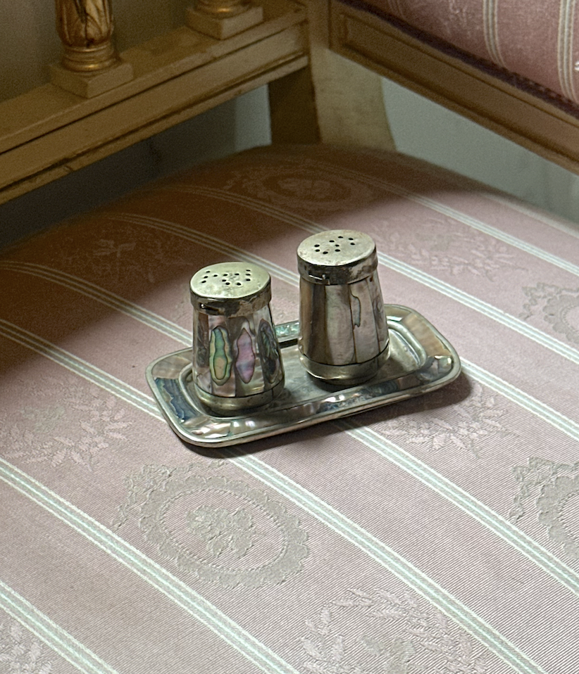 1970년도 자개와 알파카 실버를 사용한 고급스러운 소금·후추통과 트레이 세트입니다. 자연스러운 자개의 자연만이 가질 수 있는 자연스러운 무늬와 광택이 돋보이며, 수공예 특유의 유니크한 패턴이 매력적입니다. 예술적 공예품으로, 굳이 실사용하지않아도 작은 테이블웨어를 넘어 하나의 작품 같은 존재감을 보여줍니다. 컬렉터들에게 적극 추천드리는 제품입니다.