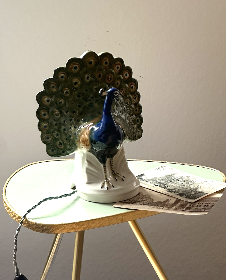 아주 매력적인 빈티지 램프입니다. 공작의 아름다움, 특히 깃털의 부드러운 곡선과 색감이