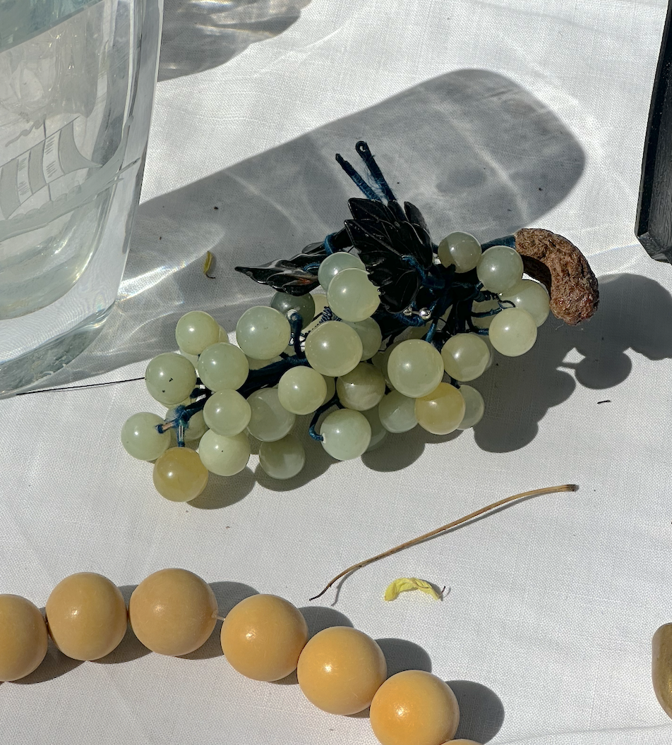 1960년도 프랑스에서 제작된 맑고 깊은 빛을 머금은 옥을 손으로 엮어 만들어진 장식용 포도송이입니다. 작은 알갱이들이 모여 포도송이를 이루듯, 매끈하게 다듬어진 옥의 결이 은은하게 빛나며 공간에 특별한 분위기를 더해줍니다. 한때 유럽 가정에서 사랑받던 오브제처럼, 책장 위에, 커피 테이블 위에, 혹은 다른 빈티지 소품들과 함께 두었을 때 자연스럽게 어우러지며 세련된 포인트가 되어줍니다. 작지만 존재감 있는 이 오브제는 시간이 지날수록 더 깊은 매력을 보여주며, 공간에 잔잔한 여유와 아름다움을 남깁니다.