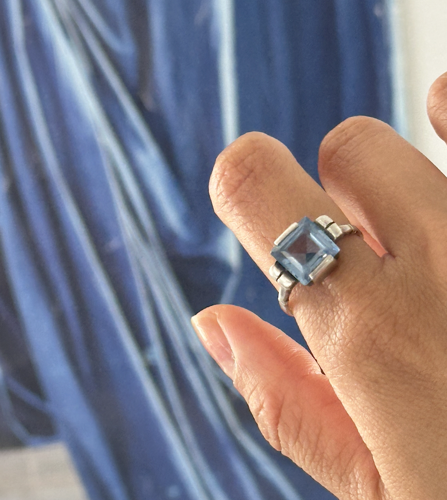 프랑스 파리에서 바잉된 유일한 디자인의 다시 구할 수 없는 리미티드 감성이 담긴 빈티지 실버 반지입니다. 맑은 푸른빛을 띠는 천연 아쿠아마린 스톤이 세팅되어 있으며 자연광에서 은은하게 반짝이는 컬러감이 특징입니다. 지나치게 화려하지 않으면서도, 착용했을 때 단정하고 고급스러운 인상을 줍니다. 약간 더 빈티지한 느낌과 톤을 지니고 있으며 잔잔한 생활감이 매력적으로 남아 있습니다. 심플한 실루엣에 원석과 금속의 밸런스가 잘 잡혀 있어 단독으로도, 다른 반지와 레이어드해도 잘 어울립니다.