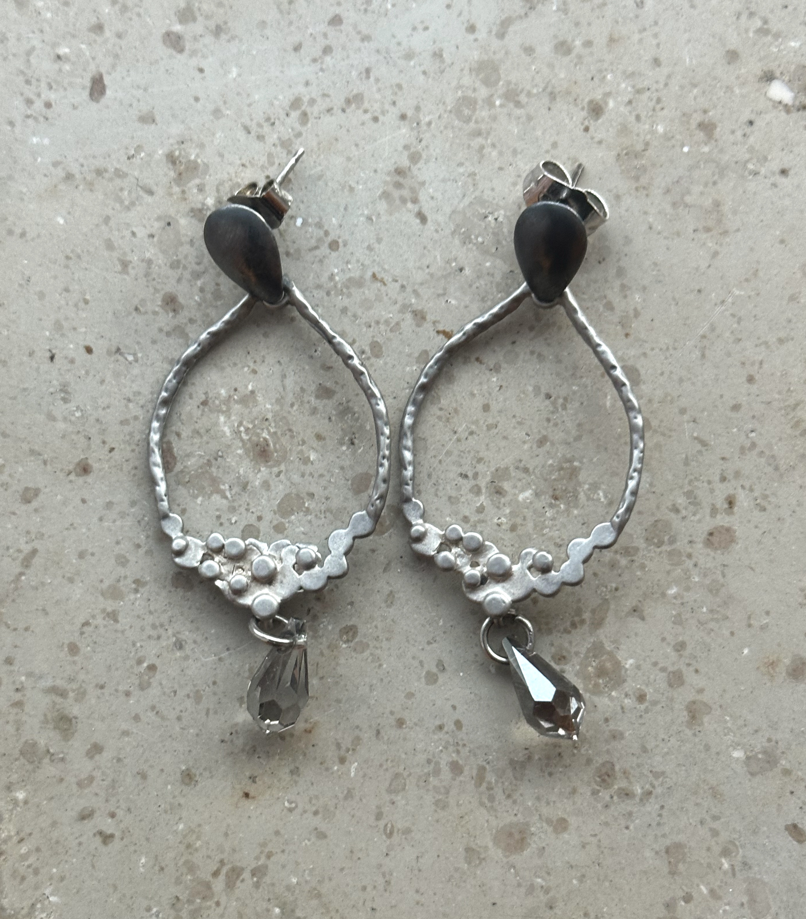 폴란드 여행중 유명한 빈티지샵에서 발견한 오랜기간 소장하고있던 정말 매력적인 실버 플레이트 빈티지 이어링입니다. 회색빛 스톤이 세련된 실루엣을 만들어내며, 움직일 때마다 은은하게 빛나 우아한 존재감을 더합니다. 전체적인 라인은 날렵하면서도 균형감이 살아 있고, 실버 플레이트의 차분한 광택이 오닉스의 깊은 블랙과 완벽한 조화를 이루어 고급스러운 무드를 선사합니다. 착용했을 때 가볍고 편안해, 데일리 룩부터 드레스업한 스타일링까지 폭넓게 어울립니다. 빈티지 특유의 시간의 결이 담겨 있으며, 현대적인 감각과 클래식함이 동시에 느껴지는 아이템입니다. 섬세한 디테일과 독특한 디자인 덕분에 실제로 보면 더욱 아름답고, 소장 가치가 높은 우아한 빈티지 주얼리입니다.