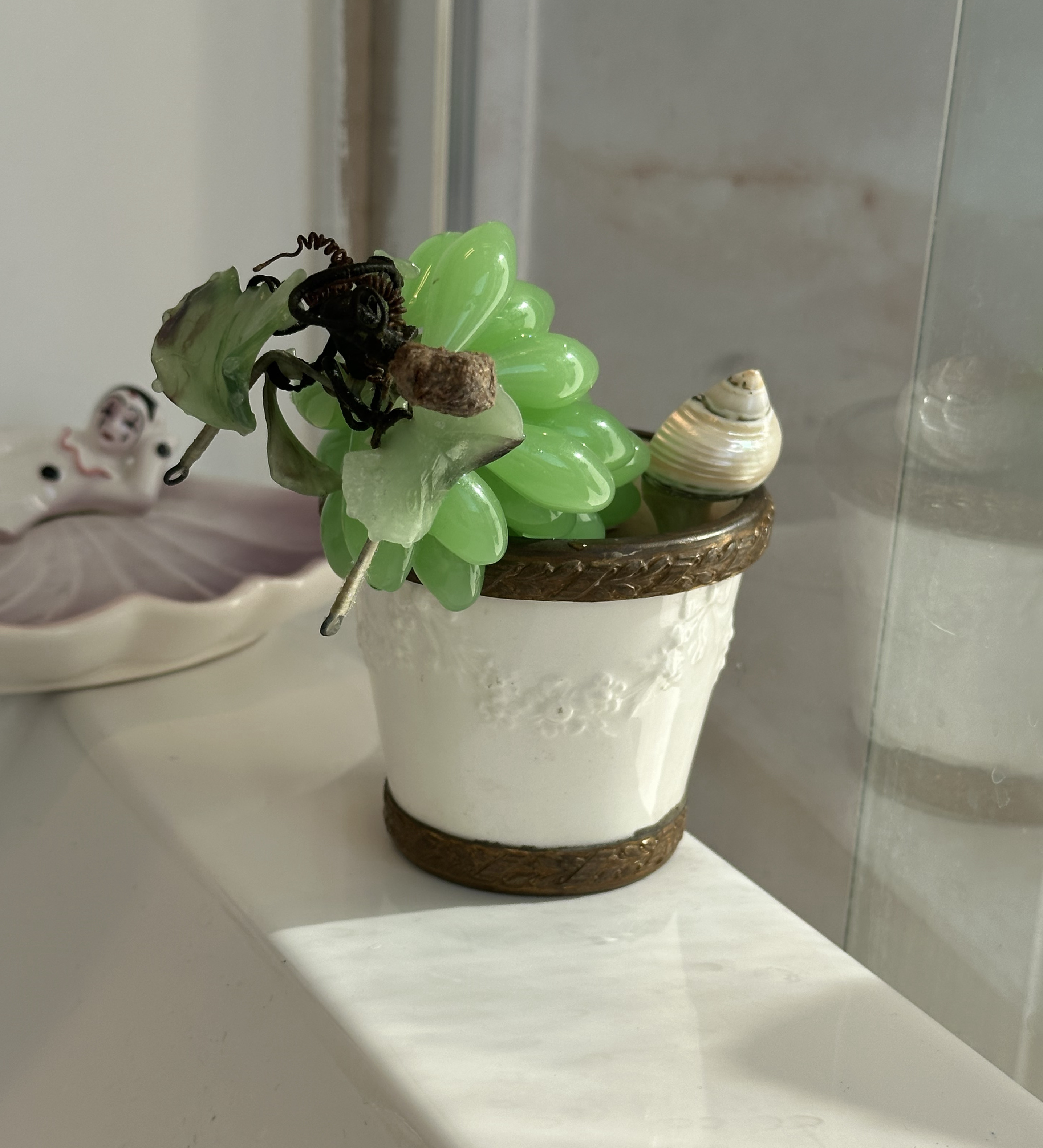 엠보싱처럼 표현된 리본 디테일이 돋보이는 프렌치 무드의 빈티지 포셀린 제품입니다. 표면에는 세월이 만들어낸 실금과 빙열이 자연스럽게 보이며, 빈티지 제품 특유의 멋을 더해줍니다. 윗부분에는 브라스 디테일이 더해져 세라믹과 조화를 이루며,