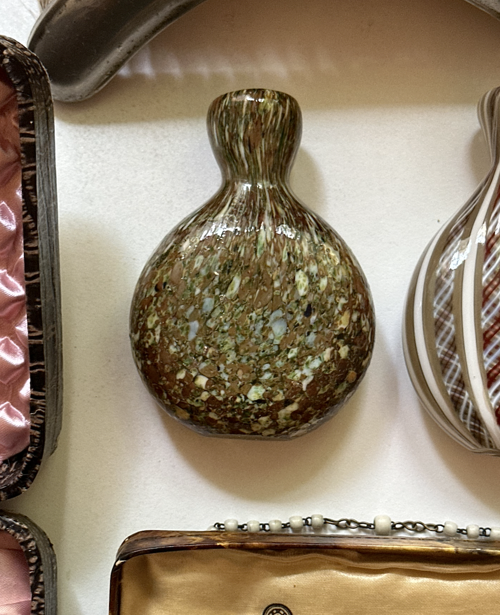 베를린에서 만난 이 작품은 독일어권 지역에서 전통적으로 사용되던 스누프타박 병으로, 담배 대신 코로 향신료를 흡입하던 고풍스러운 문화의 흔적이 담겨 있습니다. 지금은 그 아름다움 덕분에 작은 꽃병, 향수병, 장식 오브제로 사랑받고 있으며, 투명하고 섬세한 유리 안에는 전통적인 화병 형태의 실루엣이 살아 있습니다. 그 안에 담긴 디테일과 고급스러운 컬러, 고전적인 감성은 어느 공간에 두어도 존재감을 더해줍니다.