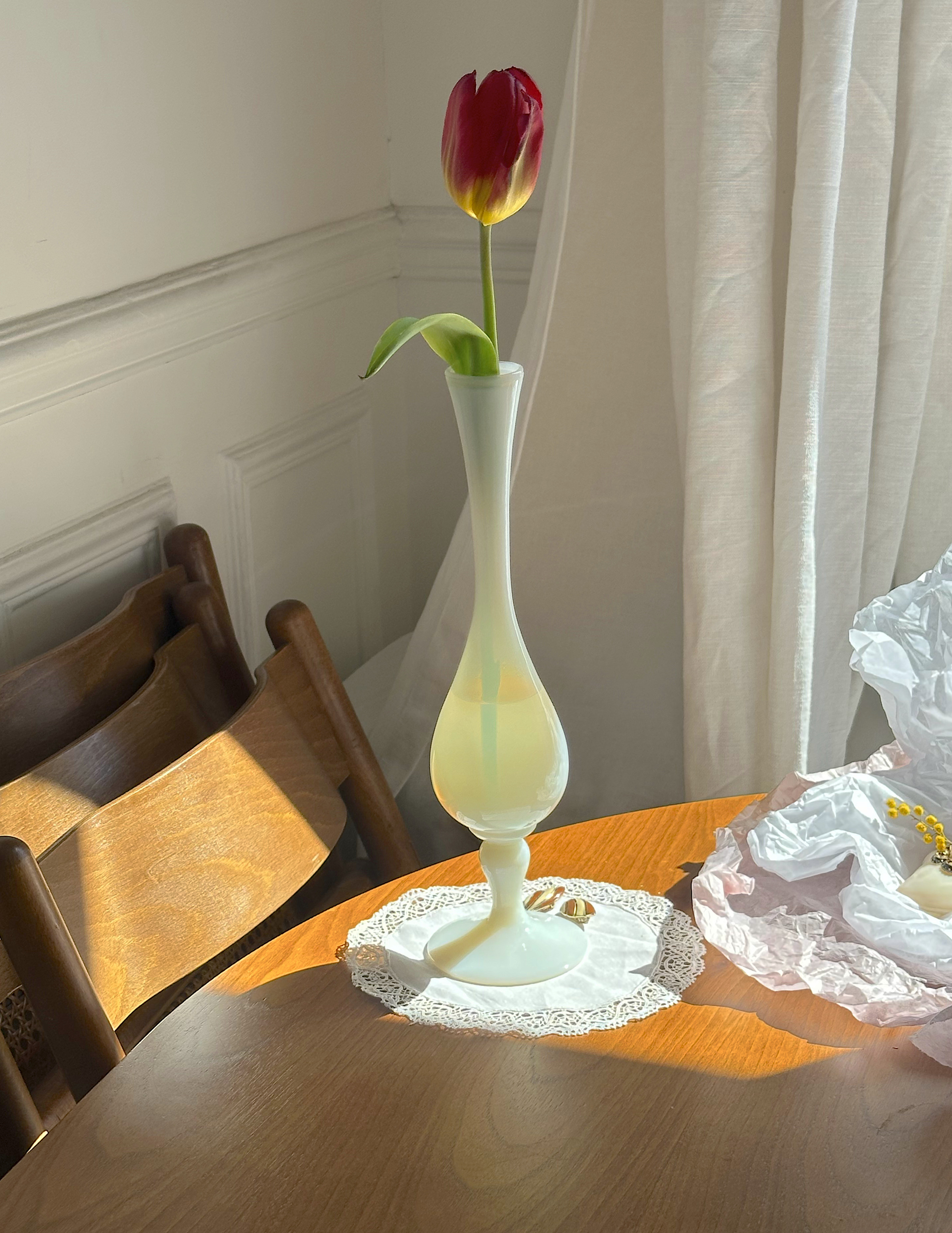 은은하고 사랑스러운 우유빛깔이 감도는 이 오팔린 글라스 화병은 프랑스 앤틱 특유의 로맨틱한 감성과 기품을 동시에 자아내는 아주 특별한 오브제입니다. 31cm의 당당한 높이에서 뿜어져 나오는 압도적인 존재감과 매끄럽게 흐르는 우아한 곡선미가 조화를 이루어 공간을 단숨에 화사하고 고급스러운 분위기로 바꿔주는 힘을 가지고 있습니다.