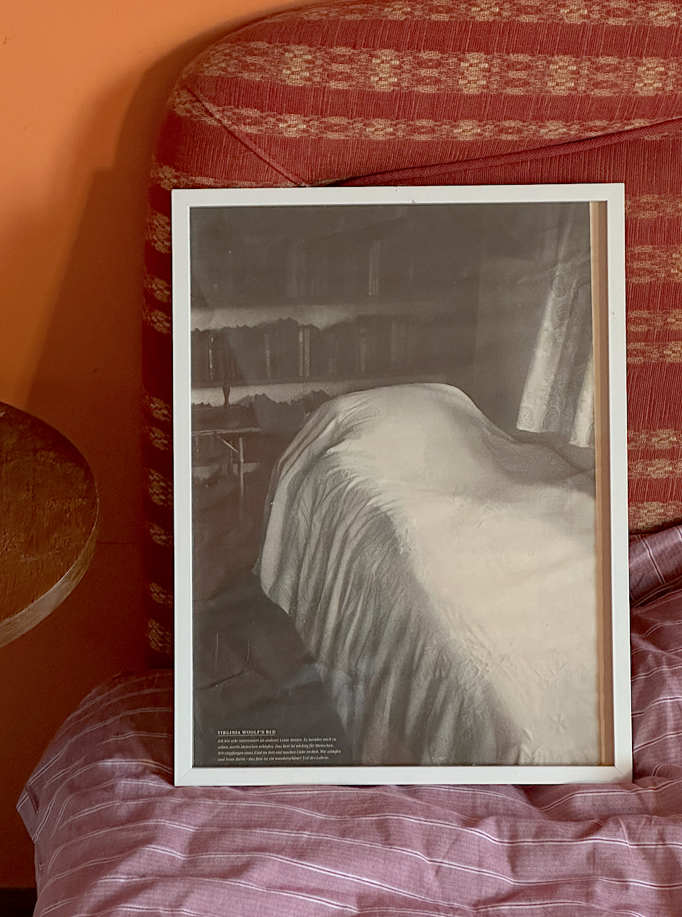 /DESCRIPTION 영국 20세기 모더니즘을 대표하는 유명한 작가, Virginia woolf (버지니아 울프)의 침대가 스크랩된 액자입니다. 많은 아티스트들과 작가들에게 영감을 주었던 버지니아 울프가 직접 살았던 집, 영국 Cambridge(캠브릿지)에 있는 Monks House는 관광객들이 자주 찾는 전시장입니다. 특히 그녀의 베드룸은 실제로 그녀의 작은 정원을 통해 들어갈 수 있는데요, 그녀가 살았던, 그녀가 많은 아이디어를 얻었던 그녀의 방 사진을 걸고있자니 신비롭고 큰 영감을 받는것같습니다. 프레임과 함께 판매되는 제품이라 따로 구매하시지않고 고급스럽게 디스플레이 하실 수 있습니다.