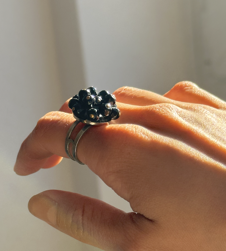 깊은 블랙 글래스 비즈가 작게 모여 꽃처럼 피어난 디자인의 빈티지 반지입니다. 실버 톤의 메탈 밴드로 만들어져 있으며, 사이즈 조절이 가능해