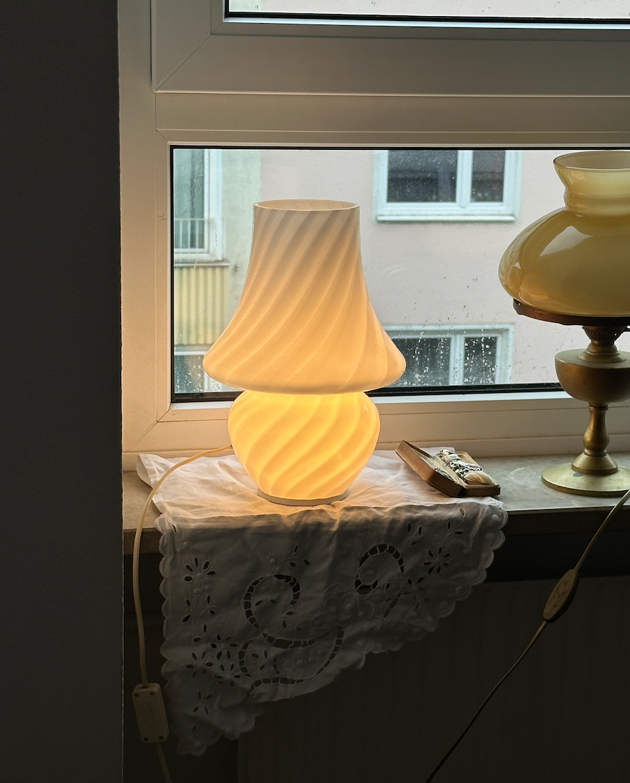 1970년대 이탈리아 무라노에서 제작된 수공예 머쉬룸 테이블 램프입니다. 전통 있는 무라노 유리 공예의 섬세함이 그대로 담긴 이 램프는, 유럽에서도 많은 컬렉터들이 찾고있고 200만원부터 1000만원까지 높은 가격대를 자랑합니다. 이 램프의 가장 매력적인점인 아래에 베이스가 있어 제품을 더 깔끔하게 보이게 하면서도 안전하게 디스플레이 하실 수 있습니다. 버섯을 닮은 유려한 곡선 형태는 1970년대 유럽 디자인의 상징적인 미감을 보여주며, 램프를 켰을 때 은은하게 퍼지는 빗살무늬 조명은 공간 전체를 부드럽고 로맨틱한 무드로 감싸줍니다. 무라노 장인들의 손길로 완성되어 예술적 가치와 빈티지 감성을 동시에 담아냈습니다. 변치 않는 클래식한 아름다움과 세월의 깊이를 간직한 이 램프는, 시간이 지날수록 가치가 높아지는 오브제 컬렉션으로 추천드립니다. 전체적으로 우아한 컨디션으로 보존되었습니다. 테스팅 완료, 스위치 on/off [유럽 직배송] 제품으로 주문 후 3주정도 소요됩니다.