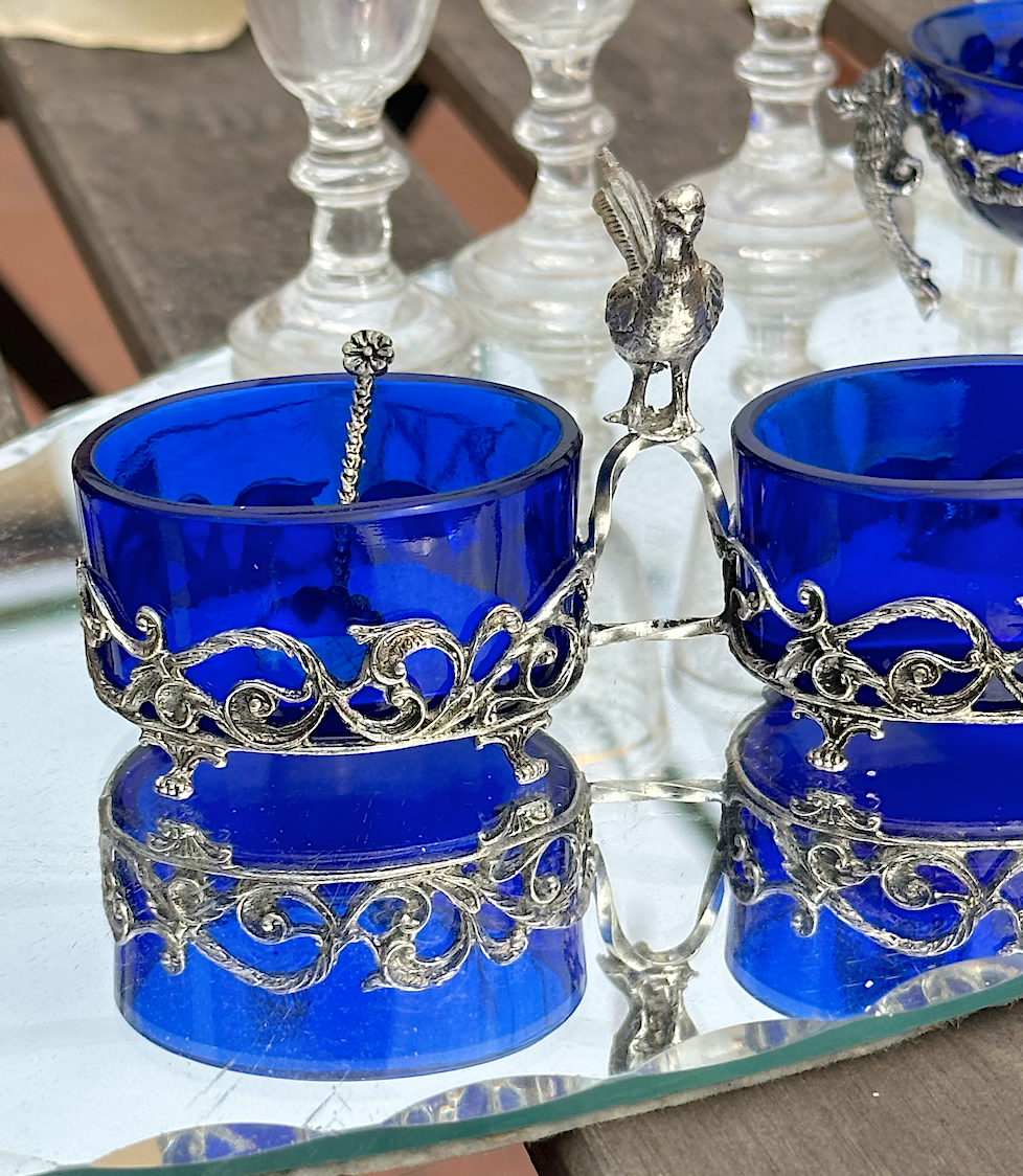 1960년도 이탈리아에서 제작된 실버 도금된 이중 솔트,페퍼 디쉬 입니다. 아름답고 쨍한 코발트 블루 컬러의 글라스로 제작이 되어있고 앤틱 발굽위 글라스를 끼우는 방식으로 디자인되었습니다. 각각의 그릇에는 작은 숟가락이 포함되어 있습니다.