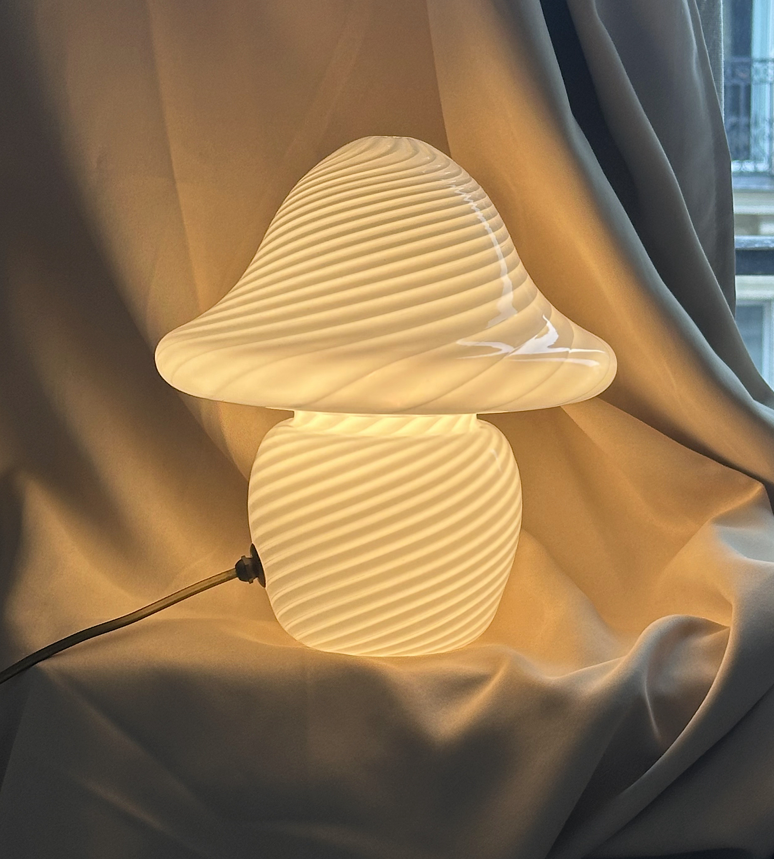 가격은 계속해서 오르고있는 모든 컬렉터들의 꿈 - 1970년대를 풍미한 오리지널 이탈리아 무라노 스타일의 빈티지 머쉬룸 램프입니다. 클래식한 필리그라나 (Filigrana) 스월 패턴이 적용된 미드 센추리 조명 디자인의 정수를 보여줍니다. 바닥에서부터 상단 캡까지 나선형으로 휘감아 올라가는 불투명한 화이트 유리 띠는 불을 밝혔을 때 환상적인 시각적 깊이와 함께 부드럽고 온화한 빛의 확산을 만들어내며 공간의 분위기를 즉각적으로 전환시킵니다. 버섯을 형상화한 유기적인 실루엣은 자연에서 영감을 얻은 형태와 장인의 핸드 블로잉 기술이 결합된 결과물로, 현대적인 인테리어와 빈티지한 공간 모두에서 독보적인 존재감을 드러내는 하이엔드 오브제입니다. 절제된 단색의 미학과 정교한 유리 공예 기법이 집약된 이 램프는 20세기 스튜디오 글라스가 지닌 예술적 깊이와 조형미를 일상 속에서 경험하게 해주는 가치 있는 피스입니다. 전체적으로 우아한 컨디션으로 보존되었습니다.