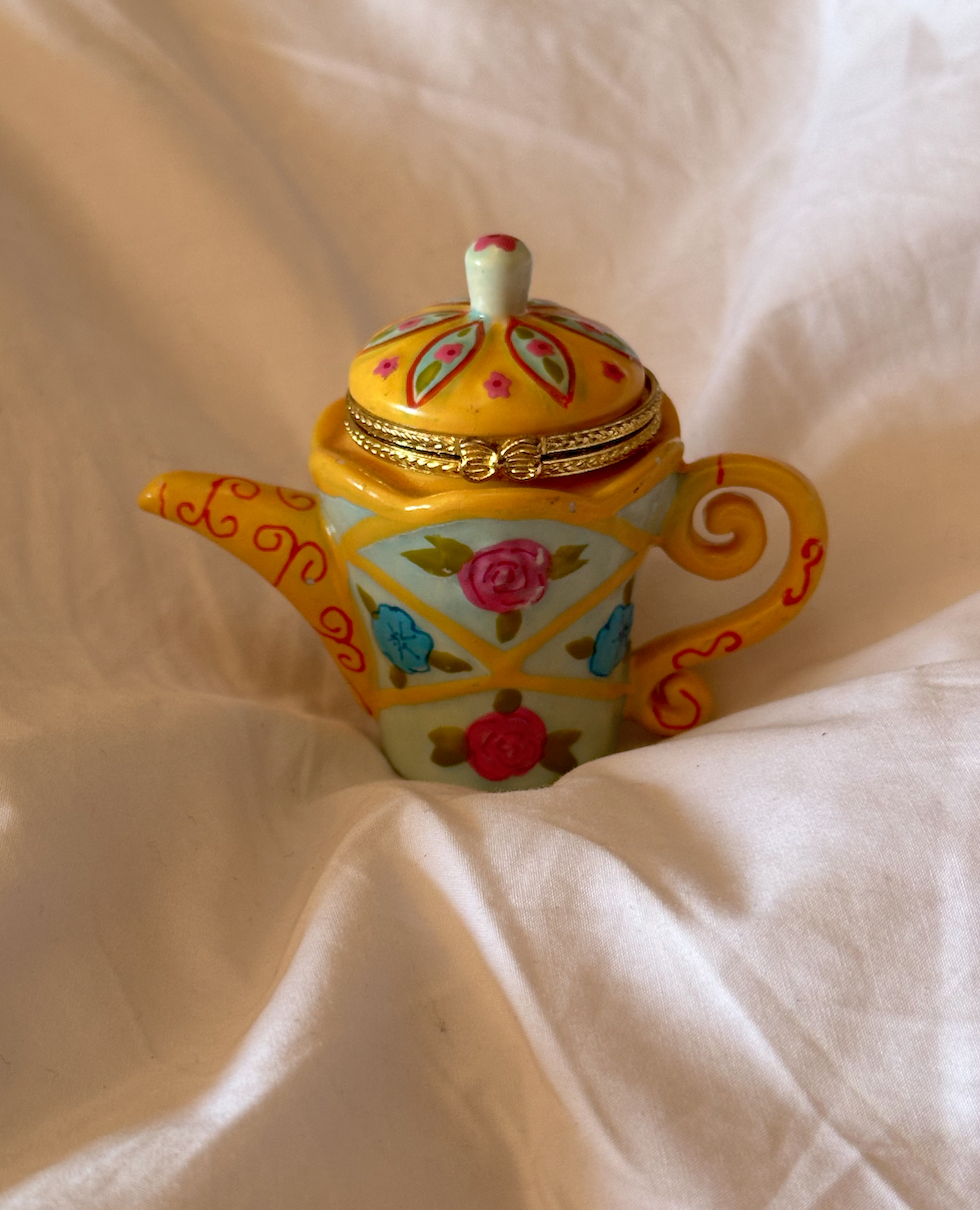 우리의 어린시절 판타지를 자극할 희귀한 빈티지 트링켓 포셀린 주얼리 박스 컬렉션입니다. 이 제품은 독특한 디즈니에서 나올법한 티팟 모양의 디자인으로, 컬러와 패턴들이 특히 매력적입니다. 특별한 디자인과 최상의 상태로 보존되어 있어 소장 가치가 높은 희귀 아이템입니다. 시각적 질감이 돋보이며 빈티지한 느낌을 한층 강화해줍니다. 이 패턴은 제품에 고급스러움과 독창성을 더합니다. 반지, 귀걸이, 목걸이와 같은 작은 주얼리를 보관할 수 있는 용도로 사용되고 공간에 디스플레이 또는 휴대용으로도 좋습니다.