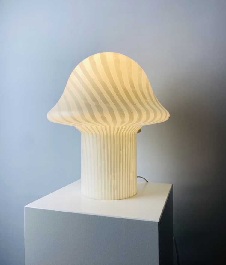 이 램프는 1970년대에 제작된 빈티지 디자인 조명으로, 독일의 유명한 유리 공예 브랜드 Peill & Putzler (1869 ~ ) 에서 만든 아이코닉한 작품입니다. 버섯형태의 독특한 디자인이 특징이며, 지브라 패턴이 조화를 이루어 모던하면서도 레트로한 감성을 자아냅니다. 입으로 불어 만들어진 유리 소재이며 일체형 구조로, 부드러운 곡선과 세련된 실루엣이 돋보이며, 불을 켰을 때 은은하고 따뜻한 조명이 퍼지면서 공간에 우아한 분위기를 더해줍니다. 미드센추리 모던과 스페이스 에이지 디자인 스타일을 대표하는 아이템으로, 빈티지 수집가나 디자인 애호가들에게 매우 인기 있는 제품입니다. Peill & Putzler의 조명 제품은 오늘날 빈티지 조명 애호가, 인테리어 디자이너, 수집가들 사이에서 높은 가치를 인정받으며, 현대적인 인테리어에도 완벽하게 어울리는 아이템으로 자리 잡고 있습니다. 훌륭한 컨디션으로 보존되었습니다. 테스팅 완료. 스위치 on/off