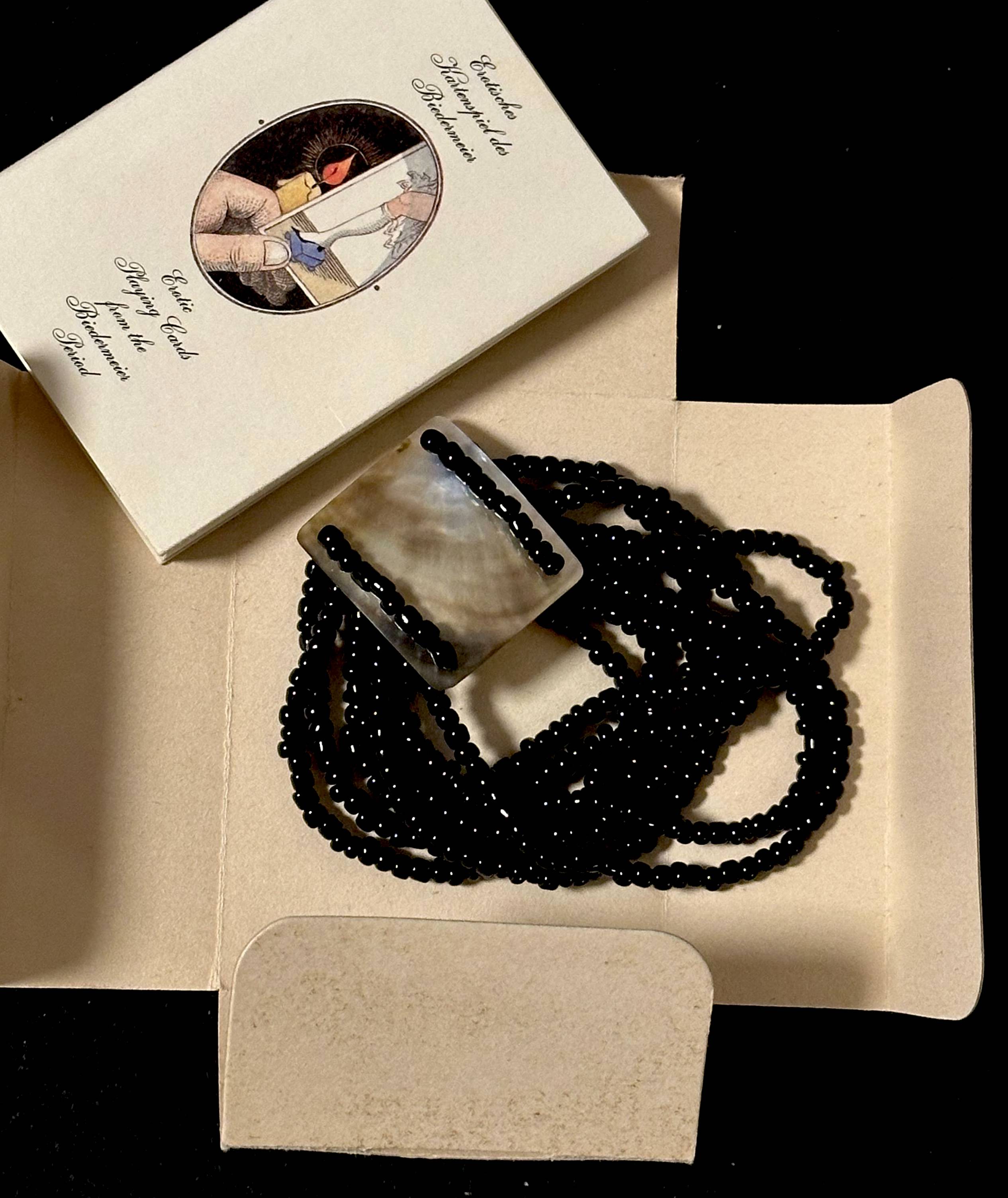 블랙 유리비즈와 마더오브펄 (자개) 로 구성된 빈티지 팔찌입니다. 서로 다른 소재가 조화롭게 어우러져 손목 위에서 은은한 빛과 깊이를 만들어내며, 빈티지 특유의 따뜻한 분위기를 느낄 수 있는 아이템입니다. 자연석 특유의 질감과 유리 비즈의 투명한 반짝임이 과하지 않게 어우러져, 단독으로 착용해도 포인트가 되고 다른 주얼리와 레이어드하기에도 좋습니다. 캐주얼한 일상 룩부터 빈티지, 클래식한 스타일에도 자연스럽게 매치됩니다. 세월의 흐름이 담긴 빈티지 제품으로, 동일한 디자인을 다시 만나기 어려운 소장 가치 있는 제품입니다.