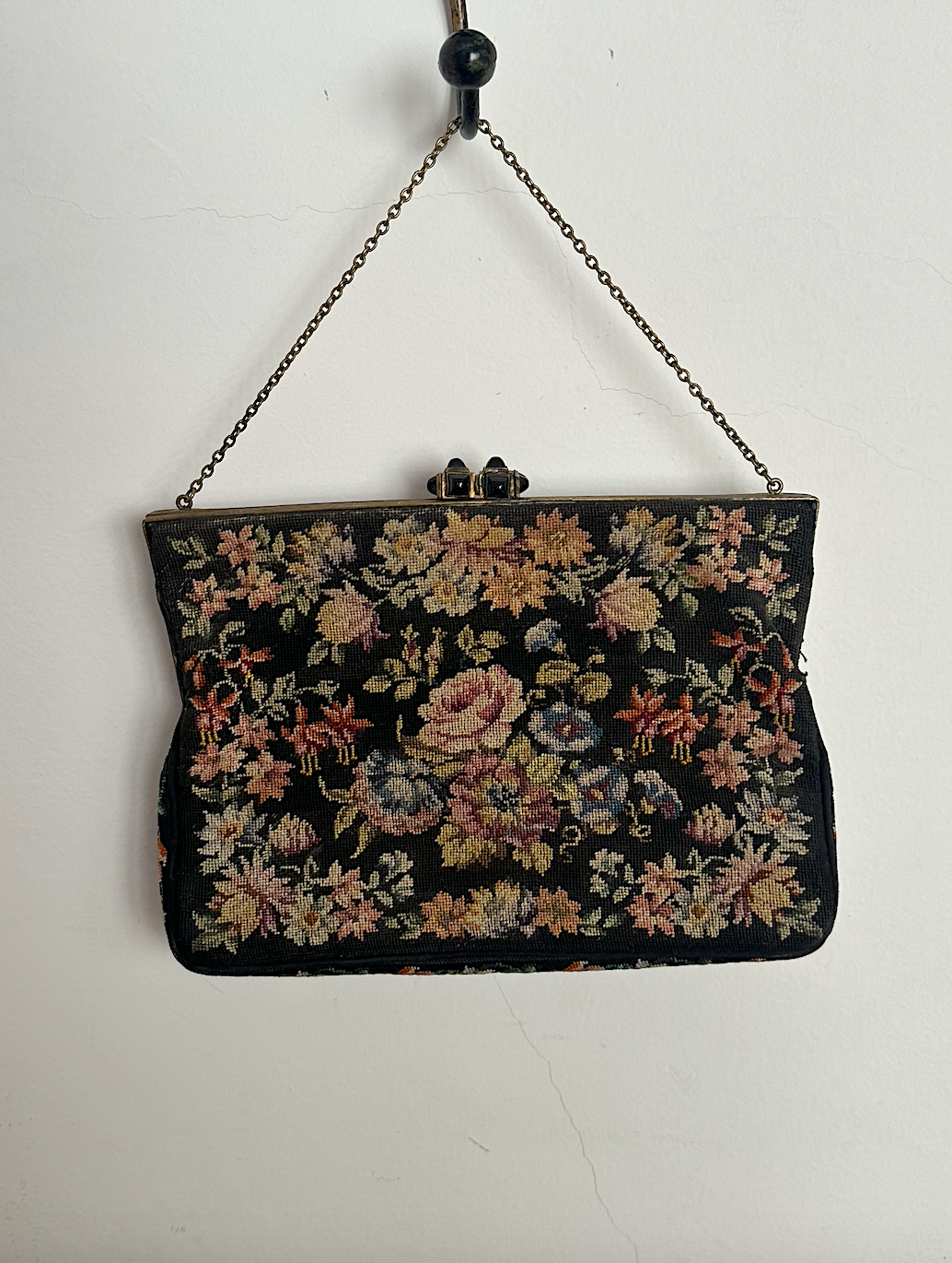 이 앤틱 이브닝 백은 1930년도 오스트리아에서 만들어진 손으로 정교하게 수놓아진 꽃무늬 디자인이 아름다운 작품입니다. 마르카사이트 (Marcasite) 장식으로 장식된 클래식한 클러치 스타일로, 작은 디테일까지 섬세하게 디자인되어 고급스러운 매력을 더합니다. 가방 전체에 니들 포인트 기법으로 아름다운 꽃무늬를 수놓아, 고풍스럽고 우아한 느낌을 줍니다. 이 기법은 정교한 바느질로 작은 꽃과 잎을 세밀하게 표현하여, 마치 회화 작품처럼 화려하면서도 섬세한 매력을 발산합니다.