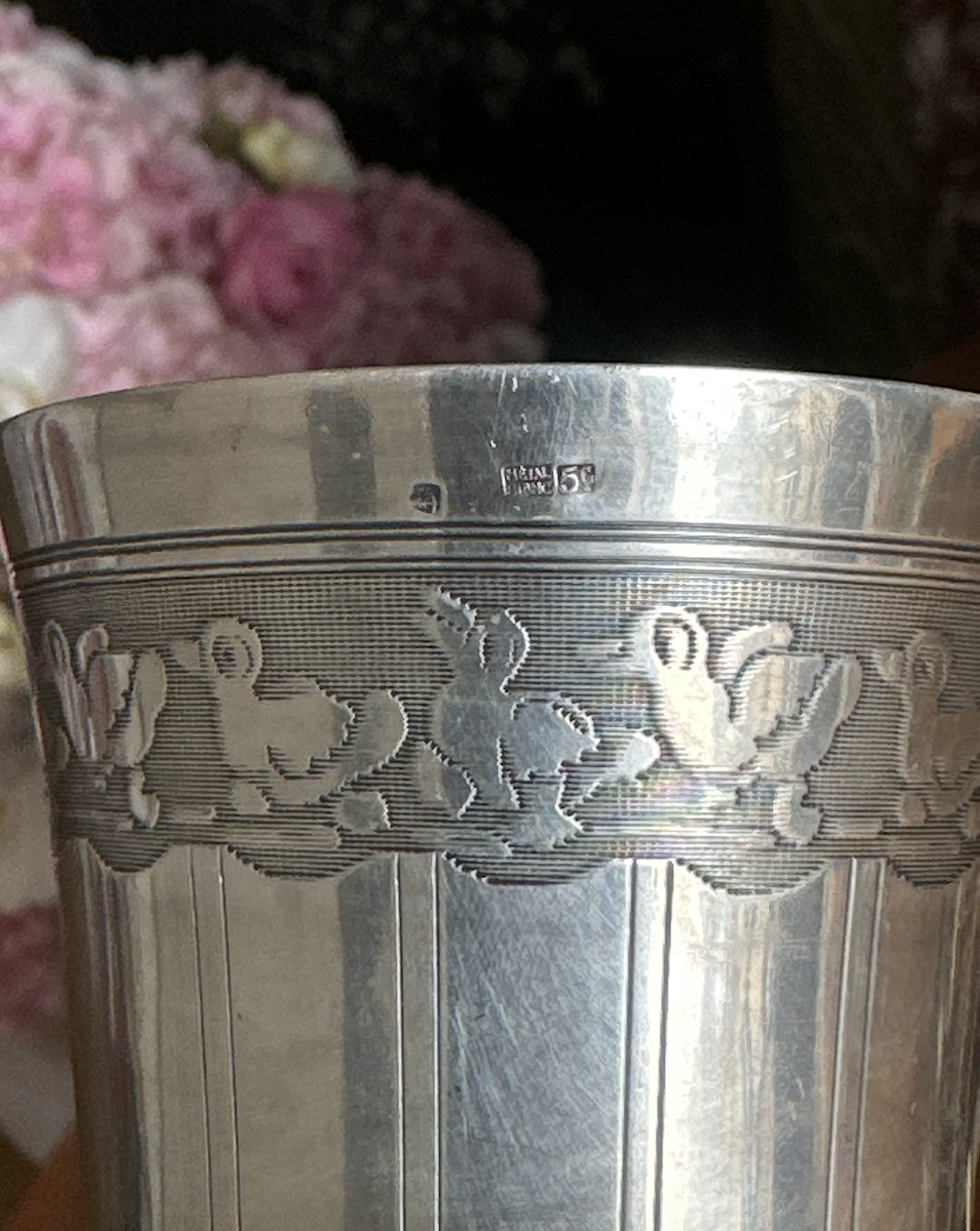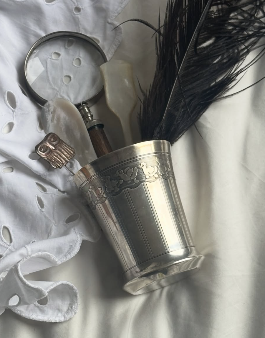 우아한 프랑스제 1960년도 실버 플레이트 오리 모티프 컵입니다. 사랑스러운 오리들이 걷고있는듯한 디자인에, 클래식하면서도 특별한 모습이 보입니다. 프랑스 은도금 특유의 단정하고 클래식한 디자인으로, 테이블웨어로 사용하기에도, 화병이나 인테리어 오브제로 장식하기에도 손색없는 아이템입니다. 제품 하단에 실버 플레이트 스탬프가 보입니다.