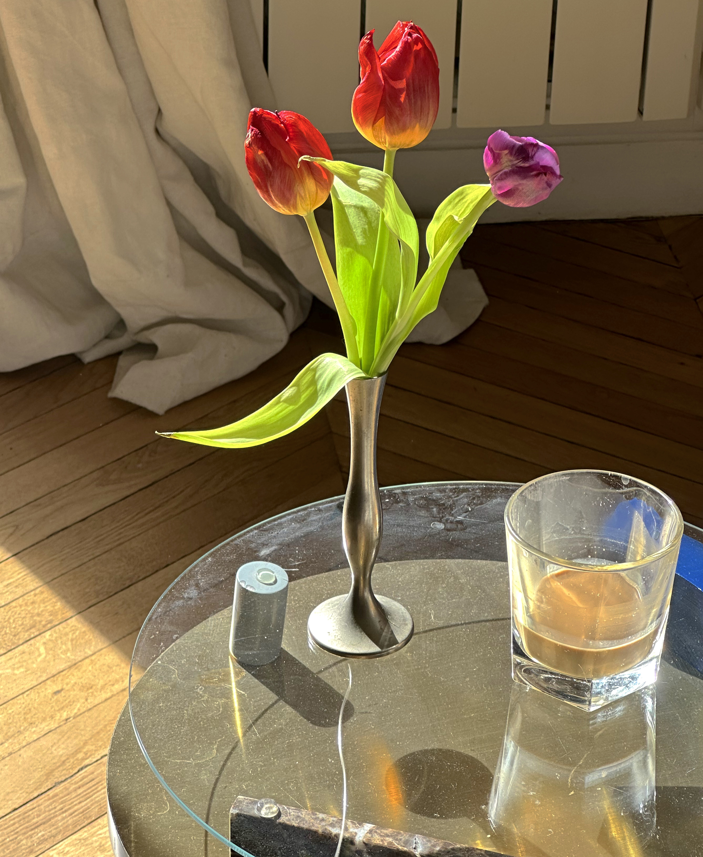 세월의 흔적이 멋스럽게 내려앉은 은은한 광택의 실버 메탈 소재가 돋보이는 이 빈티지 화병은 군더더기 없이 매끈하게 뻗은 우아한 곡선미와 미니멀한 실루엣이 조화를 이루어 어떤 공간에서도 세련된 존재감을 드러냅니다. 입구가 좁고 목이 긴 형태의 '버드 바즈(Bud Vase)' 스타일로 디자인되어 사진 속 튤립처럼 한두 송이의 꽃만으로도 드라마틱하고 예술적인 분위기를 연출할 수 있을 뿐만 아니라 묵직한 베이스가 주는 안정감과 클래식한 아우라 덕분에 꽃 없이 단독 오브제로 두어도 훌륭한 인테리어 포인트가 됩니다. 특히 대리석이나 엔틱한 가구 위에서 더욱 빛을 발하는 차가운 금속 특유의 질감은 공간에 모던하면서도 고전적인 깊이감을 더해주어 일상의 테이블 위에 시들지 않는 빈티지한 감성과 품격을 소장하고 싶은 분들에게 최고의 선택이 될 것입니다.