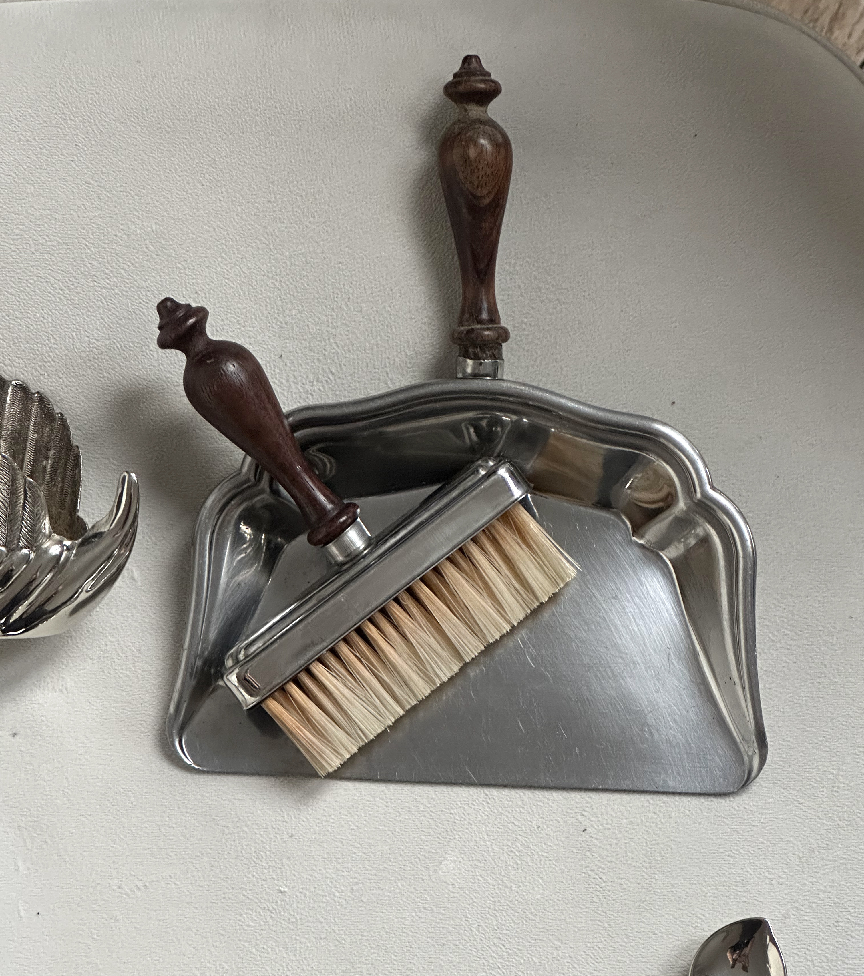빈티지 스테인리스 테이블 크럼 더스트팬과 브러쉬 세트입니다. 식사 후 테이블 위의 빵 부스러기나 작은 음식 부스러기를 깔끔하게 정리할 때 사용하는 프렌치 테이블웨어 아이템으로, 레스토랑이나 클래식한 다이닝 문화에서 사용되던 실용적인 도구입니다. 견고하면서도 깔끔한 광택이 있으며 심플하고 우아한 디자인이 특징입니다. 작은 브러시나 손으로 모은 부스러기를 담아 테이블을 정돈할 수 있어 브런치, 디너 테이블, 홈카페 등에서 유용하게 사용할 수 있습니다. 빈티지 키친 감성을 좋아하시는 분들께는 컬렉션 아이템이나 디스플레이 소품으로도 매력적인 제품입니다. 빈티지 제품 특성상 세월에 따른 미세한 사용감은 있을 수 있으나 전체적으로 좋은 컨디션을 유지하고 있습니다.
