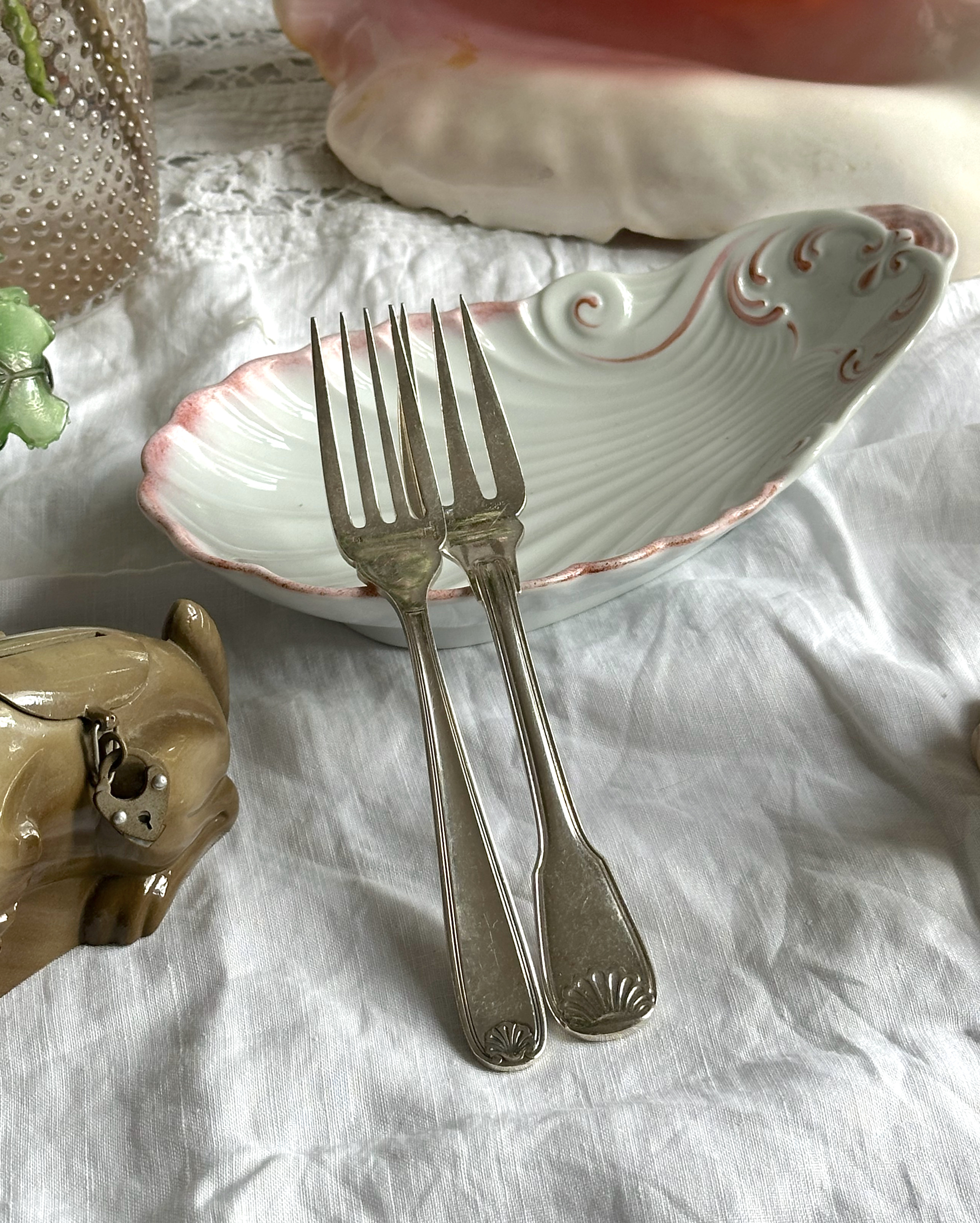 프랑스 명품 실버웨어 브랜드 Christofle의 실버플레이트 쉘 디자인의 포크입니다. 일반적인 포크와 달리, 조개 형태의 장식적인 디자인이 특징으로