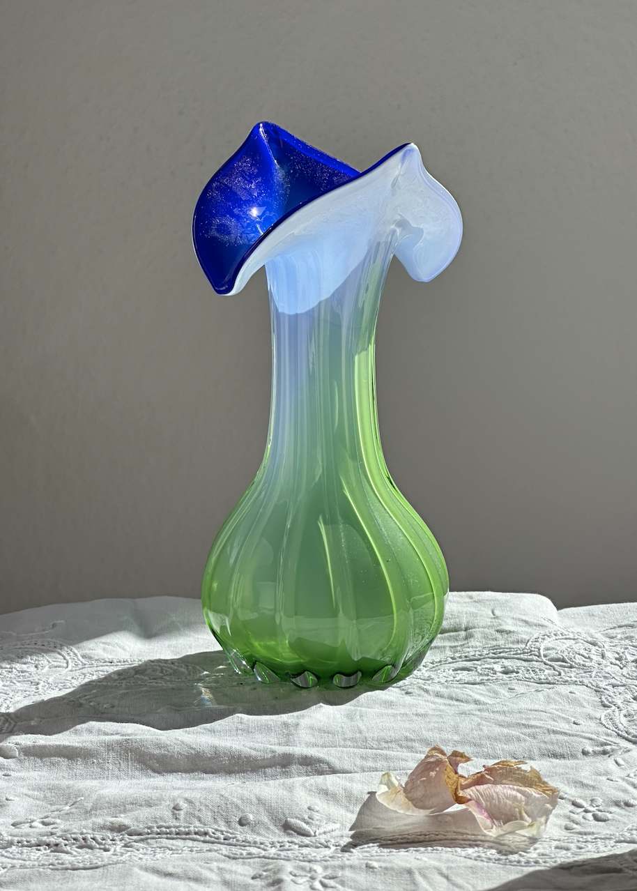 이 화병은 1970년대 빈티지 아트 글라스 화병으로 강렬한 조형미와 선명한 컬러감이 돋보이는 작품입니다. 자연물을 모티프로 만들어져 산업적이면서도 아르누보가 떠오르는 예술적인 접근이 절묘하게 어우러진 디자인을 보여줍니다. 불규칙하면서도 계산된 곡선과 입체감 있는 바디 라인이 단순한 화병을 넘어 조각 오브제 같은 존재감을 자랑합니다. 한눈에 시선을 사로잡는 디자인과 깊이있는 컬러감으로 비워 두어도 충분한 존재감, 공간의 중심이 되는 오브제가 될것입니다. 오래된 세월이 느껴지지 않는 우아한 컨디션으로 보존되었습니다.