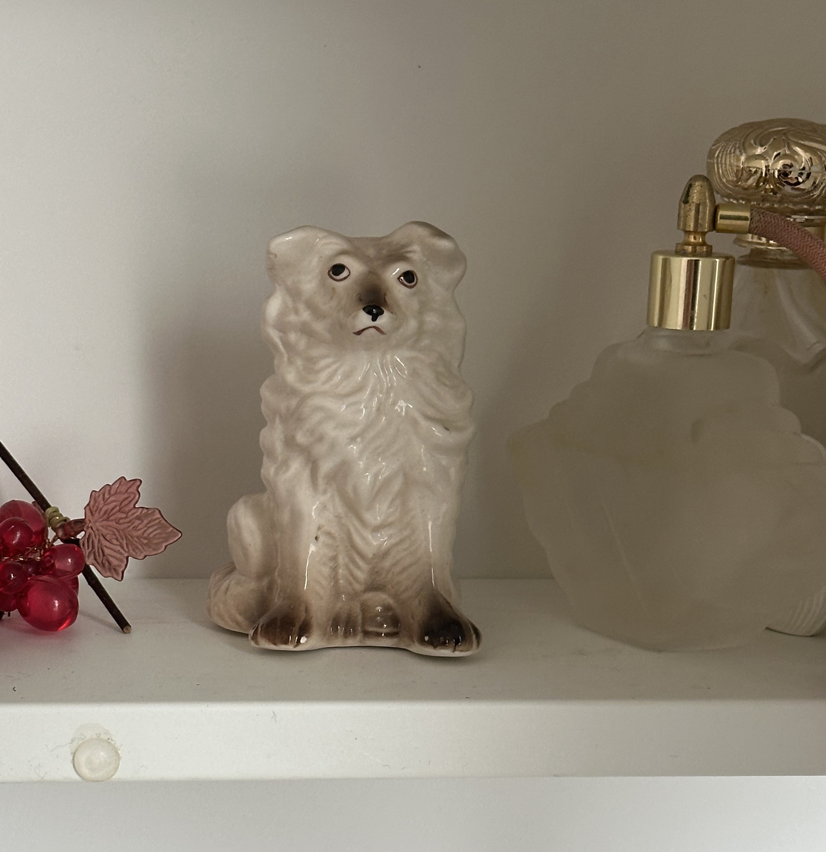 1960년도에 제작된 프랑스의 빈티지 핸드메이드 포셀린 강아지 피겨린입니다. 섬세한 수작업으로 제작되어, 우아한 체형과 풍성한 털 표현이 정교하게 묘사되어 있습니다. 조금은 삐진듯한 표정에 재치 있게 만들어진 모습으로, 수공예적 매력과 자연스러운 빈티지 분위기가 돋보입니다. 은은한 유약 마감과 부드러운 색감이 조화를 이루며, 반려견 컬렉션, 빈티지 인테리어 장식, 혹은 동물 모티프 오브제로 활용하기 좋은 아이템입니다.