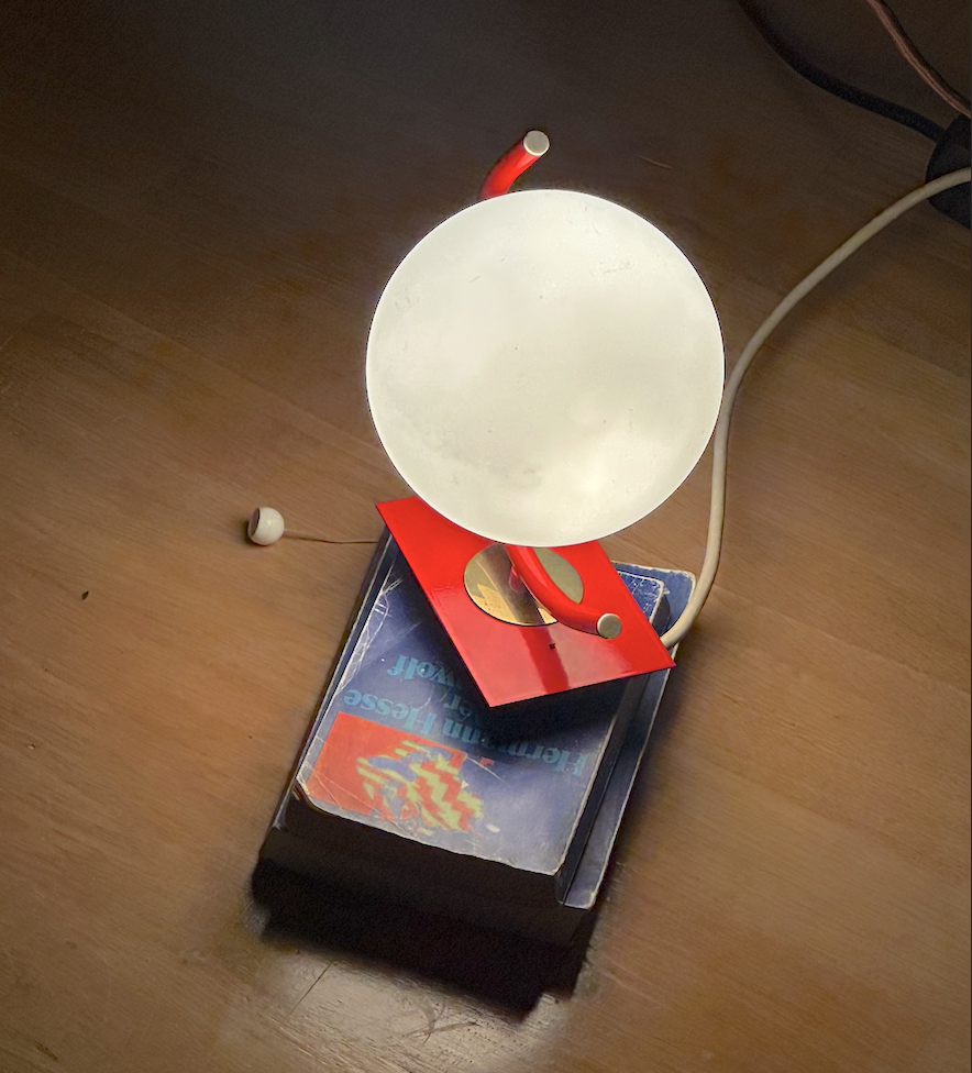 1960년대 이탈리아에서 제작된 스페이스 에이지 스타일의 오브 형태 램프입니다. 당시 미래주의 디자인에 큰 영향을 준 유려한 곡선과 강렬한 레드 컬러의 라미네이트 케이싱이 특징이며, 소장 가치가 높은 희귀한 조명 중 하나입니다. 줄 길이는 비교적 짧으며, 원래는 아래로 당겨 켜는 구조였으나 이 램프는 옆 방향으로 줄을 당겨야 하는 방식으로 업사이클링된 유니크한 개체입니다. 수동식 스위치의 위치나 방향에서 조명 하나하나에 특별함이 느껴지며, 당시의 디자인을 현대적인 방식으로 해석한 듯한 매력이 있습니다. 전체적인 사용감이 조금씩 보이나 깔끔하게 보존된 제품입니다.
