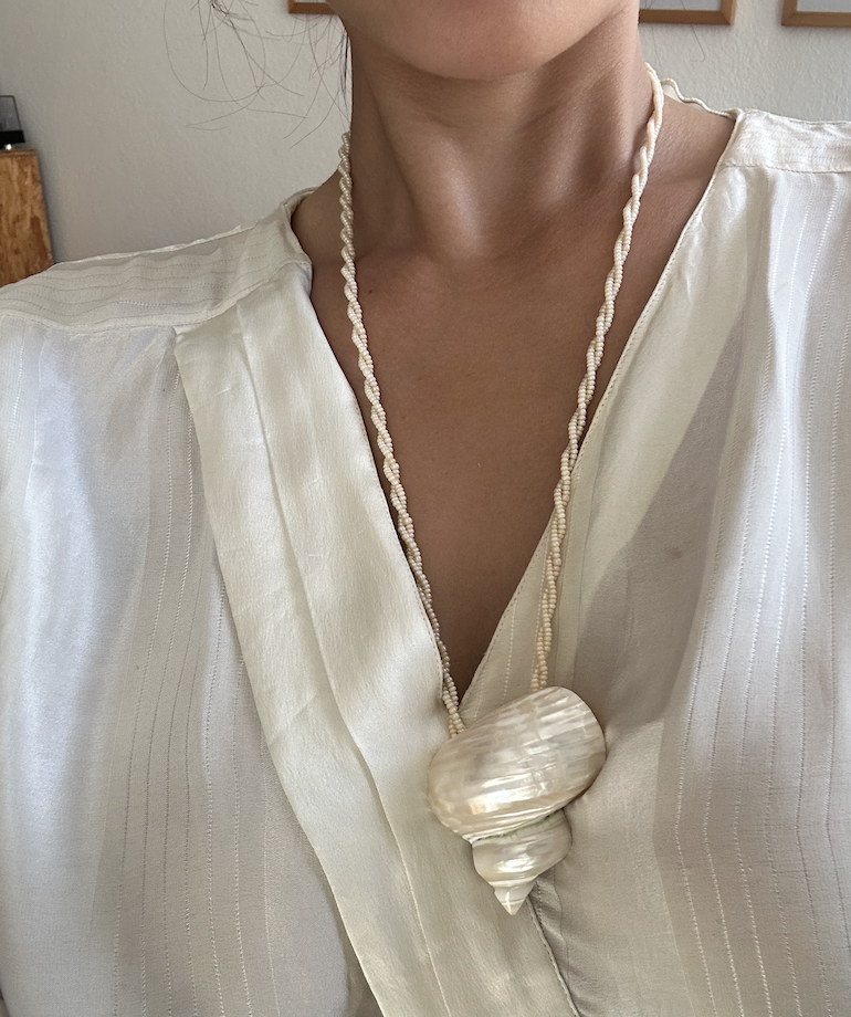 네츄럴 쉘과 진주 컬러 비즈가 어우러진 빈티지 목걸이 입니다. 쉘을 손으로 둥글게 조각해 완성한 특별한 쉘 펜던트가 중심이 되는 목걸이로 비정형의 아름다움을 지닌 천연 쉘과 고급스러운 인디 핑크 진주빛의 비즈가 부드럽게 어우러져, 사계절 내내 멋스럽게 착용할 수 있는 제품이에요. 여름에는 시원한 무드로, 겨울에는 세련된 포인트로 계절을 가리지 않고 빛나는 당신의 스타일을 완성해줄 목걸이 입니다. 쉘 팬던트는 빼서 다른 체인 목걸이와 매치하셔도 실용도가 높고 훌륭한 디자인을 완성시켜줄것입니다.