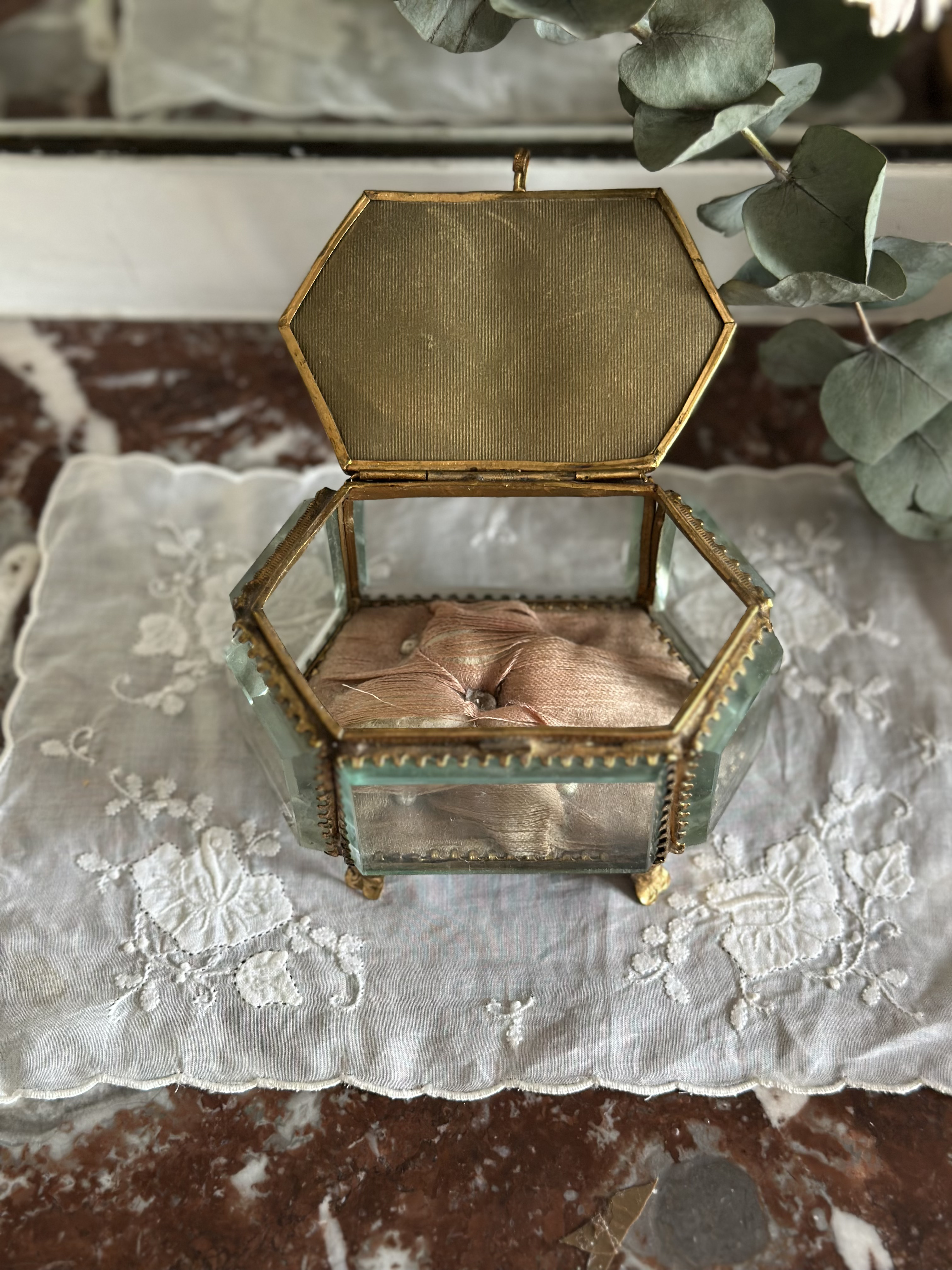1880년도에 제작된 19세기 프랑스 나폴레옹 3세 시대에 제작된 레어하고 뛰어난 장인의 손길이 느껴지는 보석 상자입니다. 리옹의 푸르비에르 언덕(Coteau de Fourvière) 을 모티프로 제작된 빈티지 트링캣입니다. 8각형 구조의 투명 유리로 만들어져 내부가 잘 보이며, 골드 브론즈 장식이 우아함을 더합니다. 소중한 보석이나 작은 소품을 담아 보관하는 오브제입니다. 벨 에포크 시대 (1871-1914) 는 프랑스의 아름다운 시절이라고 불리는 미를 추구하는 예술가들의 삶이였는데요, 이 제품이 상류층의 우아함이 아름답게 반영된 작품입니다. 소장가치를 지닌 걸작으로서, 컬렉터, 특별한 역사적 가치를 찾는 분들에게 완벽한 아이템입니다. 그 희소성과 예술적 완성도 덕분에 소장용, 장식용, 또는 특별한 선물용으로 이상적인 아이템입니다. 제품은 소리를 내며 잘 닫히지만 완벽히 중앙을 이루진 않습니다. 이 부분은 앤틱 제품으로 사용감이 자연스러운 부분입니다. 유리마저 깨진부분 없이 우아한 컨디션으로 보존되었습니다.