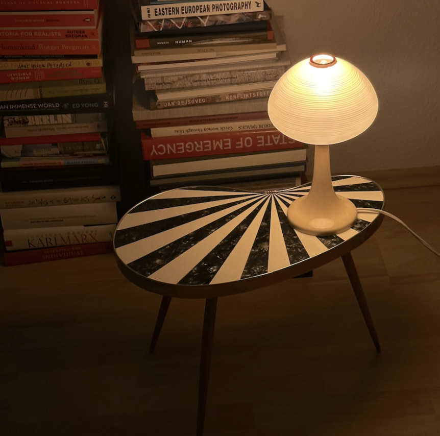 이 독특한 테이블 머쉬룸 램프는 1970년대 독일의 조명 브랜드 Aro Leuchten에서 제작한 스페이스 에이지 디자인의 대표적인 작품입니다. 버섯을 닮은 실루엣, 부드러운 곡선의 플라스틱 베이스와 글라스 쉐이드가 어우러져 빛을 머금고 있는 듯한 느낌이 들어요. 당시 우주 시대에 대한 낙관과 미래지향적 미감을 그대로 담고 있어요. 램프를 켜면 은은하게 퍼지는 따뜻한 빛이 공간을 감성적으로 채워주며, 무드등으로나 포인트 조명으로 훌륭합니다. 베이스의 칩들이 조금씩 보이지만 거슬리는 부분은 아닙니다. 이 부분을 제외하고는 우아하게 보존되었습니다.