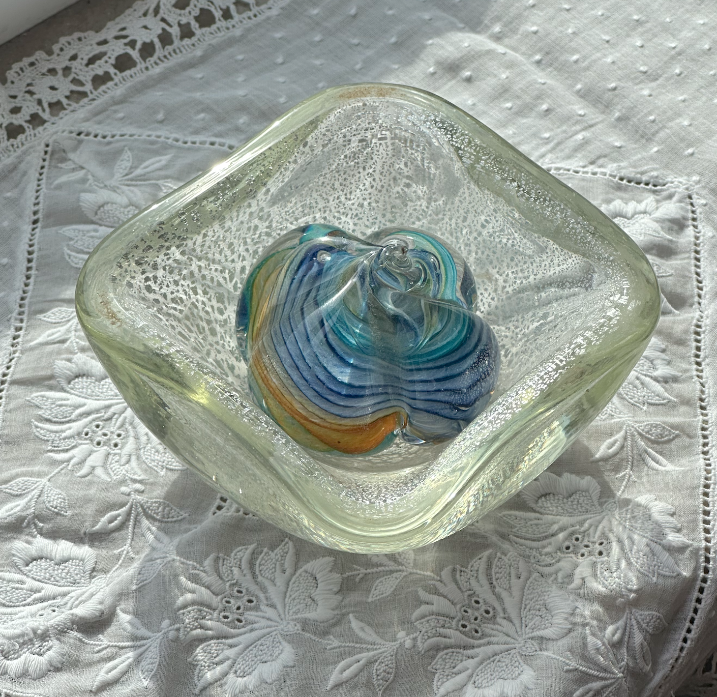 1960년도 독일에서 제작된 생크림 모양 빈티지 아트 글라스 페이퍼웨이트 입니다. 부드럽게 소용돌이치는 듯한 표면은 마치 생크림을 떠올리게 하는 크리미한 질감으로, 보는 순간 미소가 지어지는 사랑스러움이 담겨 있습니다. 종이나 테이블 위 올려두어 디스플레이하시면 인테리어 오브제로 훌륭합니다. 민트 컨디션을 유지하고 있으며, 장식성과 실용성을 겸비한 특별한 빈티지 아이템입니다.