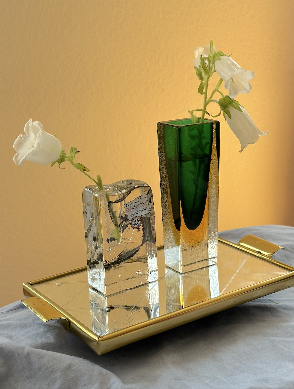 보통 유럽의 시세는 60만원이 넘는 1934년 이탈리아 무라노에서 설립된 유리 공방으로, Alessandro Mandruzzato는 이 가문의 4세대 유리 장인이며, 전통적인 무라노 유리 기법을 현대적으로 재해석하여 독특한 디자인을 창조하였고 특히 기하학적이고 입체적인 디자인과 색상의 조화를 활용한 작품들이 많습니다. 어려운 기술로 알려진 이 Sommerso (솜메르소) 기법은, 유리를 전문적으로 제작하여 두 가지 이상의 색상이 층을 이루며 투명하게 겹쳐지는 유리 제작 기법 내부에 다른 색상이 감싸져 있는 듯한 시각적 효과를 줍니다. 일반적인 유리보다 두꺼운 크리스탈 유리로 제작되어 아주 묵직한 느낌이 듭니다. 이 화병은 미드센추리 모던 디자인의 대표적인 유리 공예 작품으로, 앤틱 수집가 및 인테리어 디자이너들 사이에서 높은 인기를 끌고 있습니다. 눈에 띄지 않는 아주 작은 칩을 찾았는데 그 부분을 제외하곤 전체적으로 우아하게 보존되었습니다.