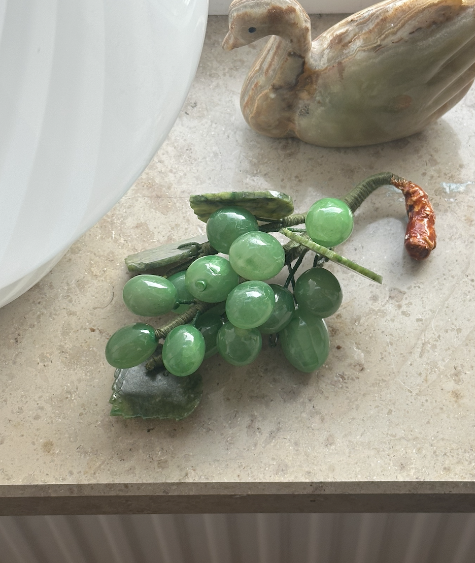 1960년도 프랑스에서 제작된 맑고 깊은 빛을 머금은 옥을 손으로 엮어 만들어진 장식용 포도송이입니다. 작은 알갱이들이 모여 포도송이를 이루듯, 매끈하게 다듬어진 옥의 결이 은은하게 빛나며 공간에 특별한 분위기를 더해줍니다. 한때 유럽 가정에서 사랑받던 오브제처럼, 책장 위에, 커피 테이블 위에, 혹은 다른 빈티지 소품들과 함께 두었을 때 자연스럽게 어우러지며 세련된 포인트가 되어줍니다. 작지만 존재감 있는 이 오브제는 시간이 지날수록 더 깊은 매력을 보여주며, 공간에 잔잔한 여유와 아름다움을 남깁니다.