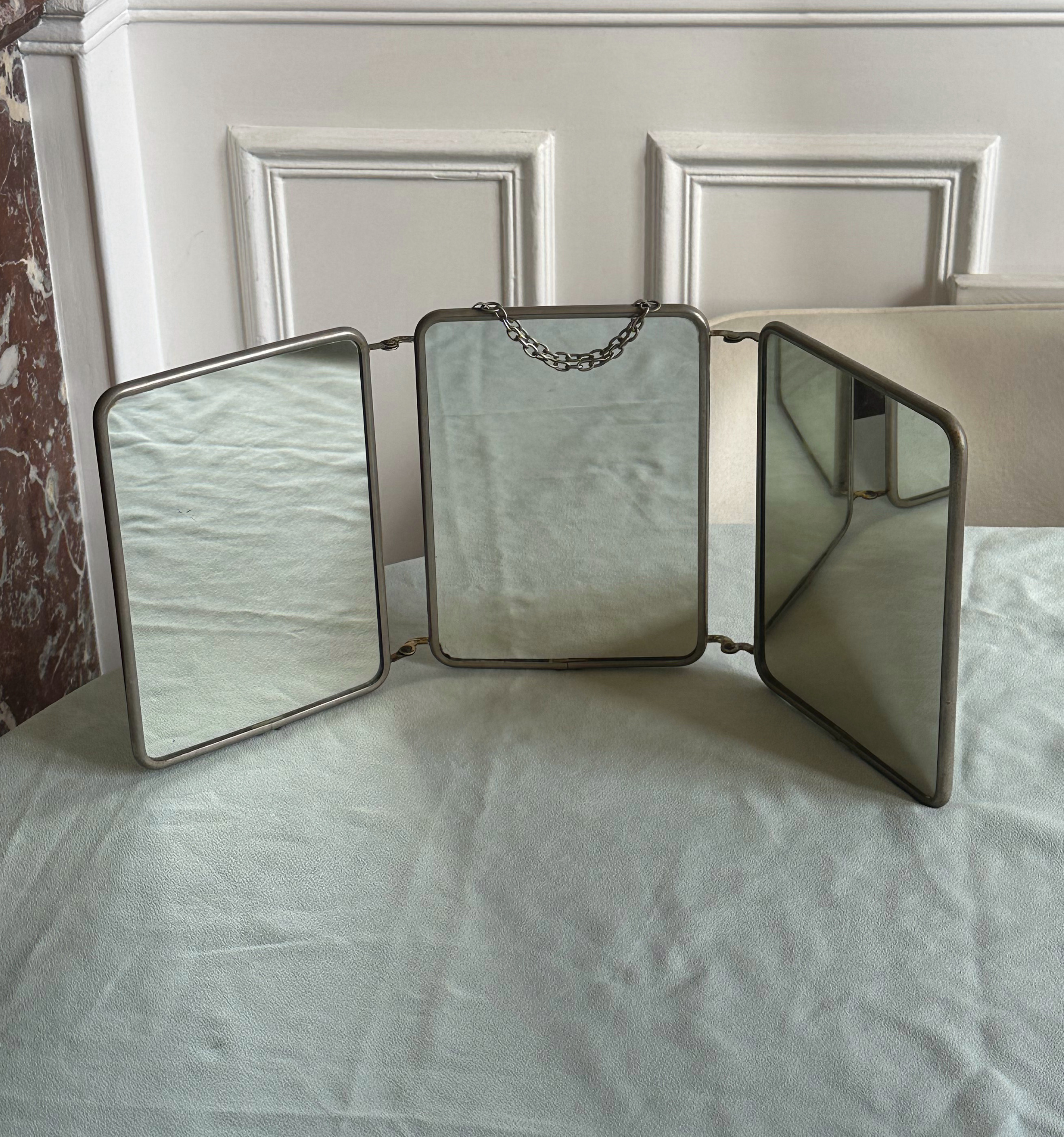 영화 몽상가들의 유명한 장면중 하나인 목욕을 하는 장면에서 나왔던 너무나 매력적인 3단 거울입니다. 제품을 3면의 거울로 열어둘 수 있어 공간에 깊이와 클래식한 분위기를 더해줍니다. 특히 이 제품의 매력은 잠시 접어둘때 빈티지한 무드가 가득 느껴지는 뒷면의 진한 그린 컬러에서 더 강하게 느껴집니다. 벽에 걸어도 좋지만, 접어서 세워두거나 벽에 기대어 두기만 해도 공간의 무드가 단숨에 바뀌며 다양한 연출에 활용할 수 있는 실용적인 오브제입니다. 잔잔한 스크래치와 표면의 시간의 결이 오히려 이 거울만의 분위기를 살려주는 요소로 작용해 빈티지 애호가에게는 소장 가치가 매우 높은 아이템입니다. 뒷면에는 사용감이 보이는 제품으로 그부분 감안하여 가격조정 되었습니다.