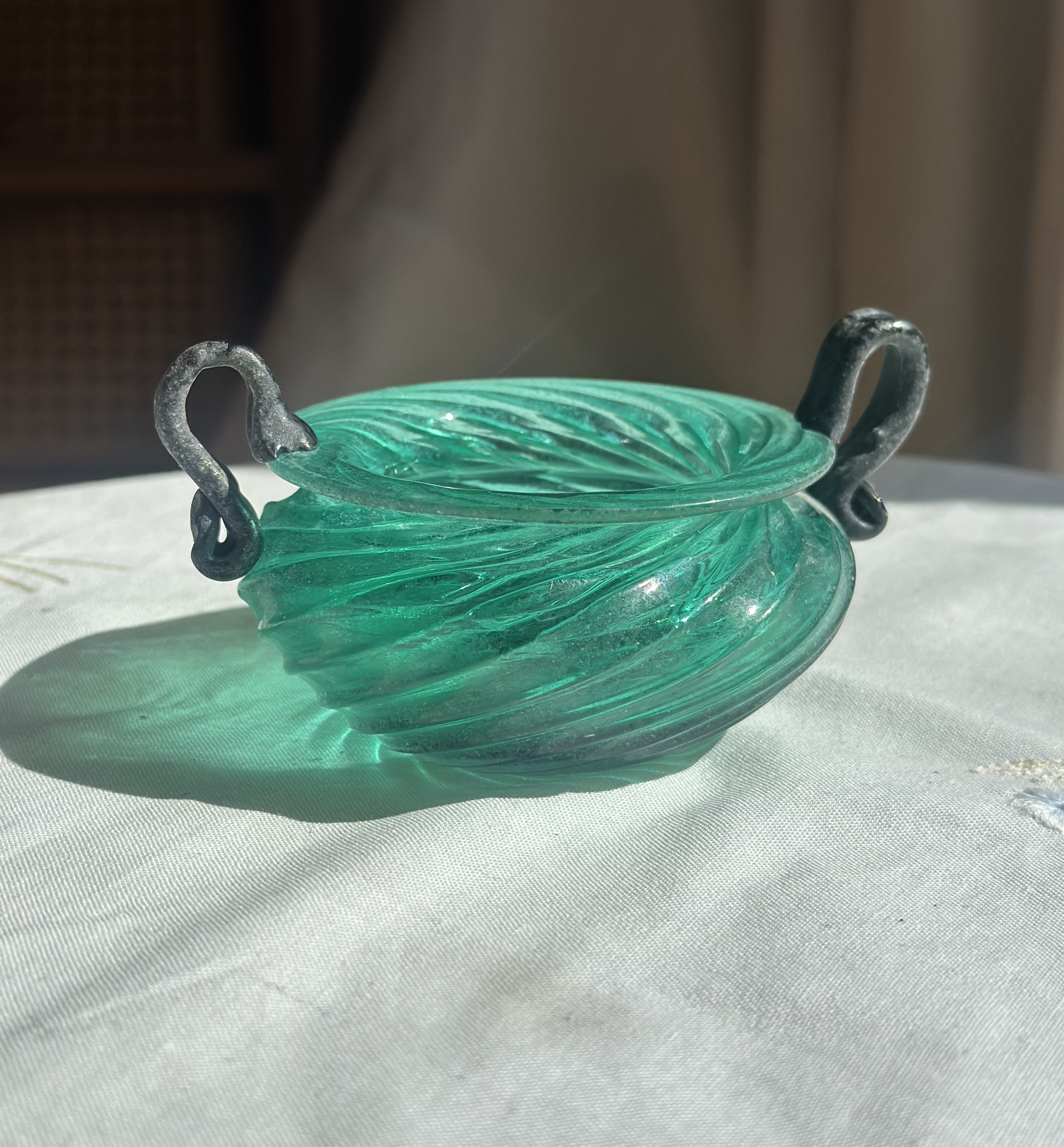 컬렉가치가 높은 이 진귀한 1940년도 오리지널 무라노 글라스 보울은 베네치아 유리 공예의 예술적 깊이를 상징하는 마스터피스입니다. 베네치아의 석호를 닮은 찬란한 에메랄드빛 녹색 유리 위에 새겨진 환상적인 소용돌이 패턴이 생동감 넘치는 에너지를 발산합니다. 20세기 중후반 이탈리아 장인 정신의 정수를 보여주며, 입으로 불어 만든 유리의 유기적인 형태와 서예적인 우아함으로 곡선을 그리는 두 개의 어두운 톤 핸들 장식이 극적인 대비를 이룹니다. 나선형으로 휘몰아치는 유리의 정교한 텍스처는 빛을 머금고 굴절시키며 오직 진품 무라노 글라스만이 구현할 수 있는 독보적인 시각적 깊이를 만들어내며, 이는 단순한 그릇을 넘어 하나의 살아있는 예술적 오브제로서 존재감을 드러냅니다. 세월이 흘러도 변치 않는 투명함과 광채를 간직한 이 오제티 컬렉션은 세련된 공간의 중심을 잡아주는 하이엔드 센터피스로서, 수세기 동안 세계 유리 공예의 정점으로 군림해 온 무라노 장인 정신의 깊이를 당신의 일상 속에 고스란히 전해줄 것입니다. 아끼는 주얼리를 넣어두어 디스플레이 하시거나 설탕그릇으로, 취향에 맞게 사용해보세요.