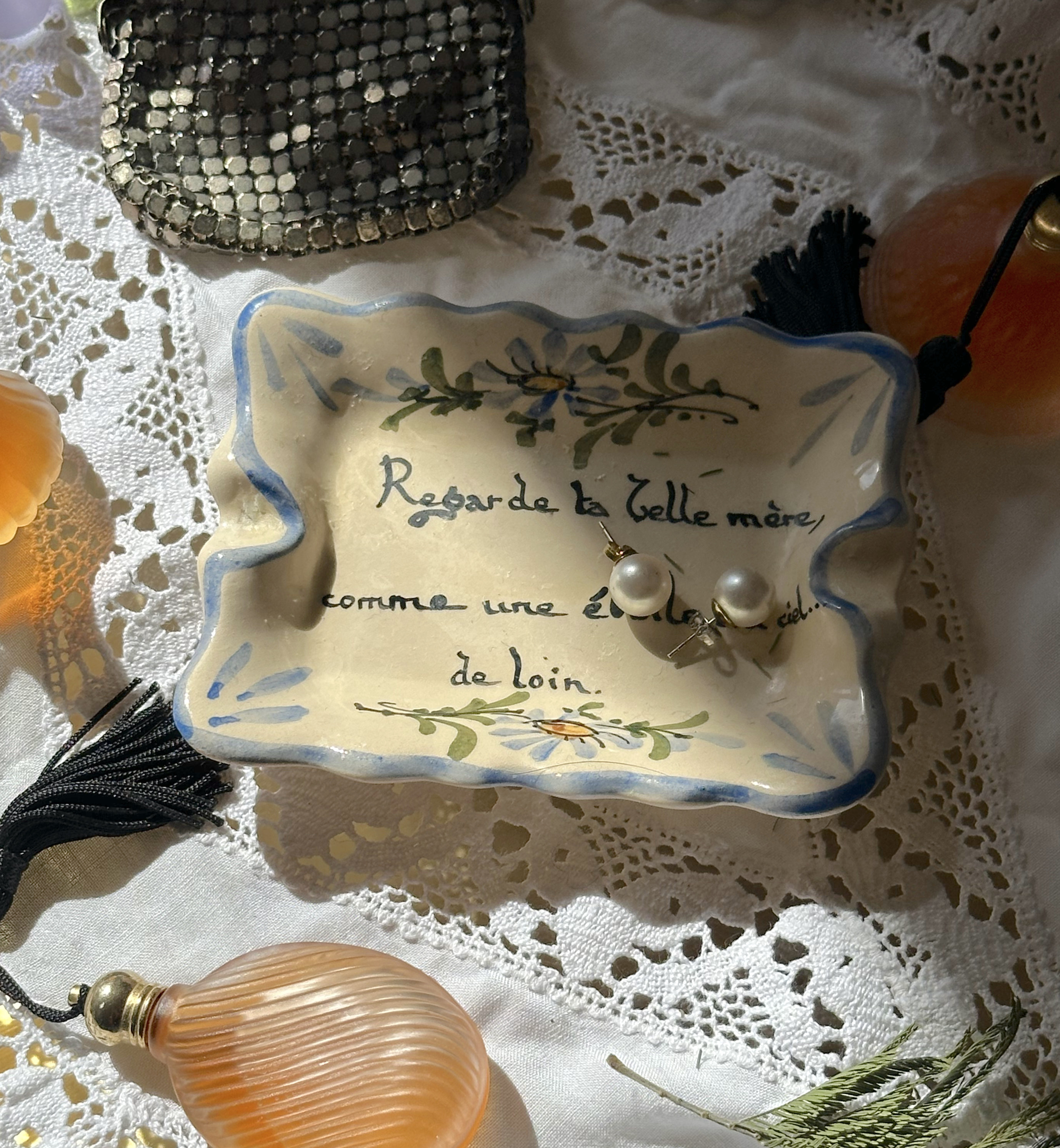 부드러운 크림빛 곡선이 돋보이는 프랑스 핸드페인트 세라믹 위에 섬세한 푸른빛 야생화가 수놓아진 이 오브제는 "시어머니는 하늘의 별처럼 멀리서 볼 때 가장 아름답다"는 반전의 프랑스식 위트를 우아한 필기체로 담아내어 공간에 독보적인 가치와 유쾌한 대화의 즐거움을 동시에 선사하는 유일무이한 빈티지 포셀린 보울 입니다. 물결치는 듯한 테두리와 청량한 블루 라인이 핸드페인트 특유의 따뜻한 질감과 어우러져 고전적인 아름다움을 극대화할 뿐만 아니라 소중한 주얼리를 올려두는 트레이나 인테리어 포인트 소품으로 활용하기에 최적화되어 있어 겉보기에는 한없이 우아한 장식품 같지만 그 속에 담긴 뼈 있는 농담이 반전 매력을 더해 프랑스 빈티지 컬렉터와 감각적인 선물을 찾는 분들에게 최고의 선택이 될 것입니다.