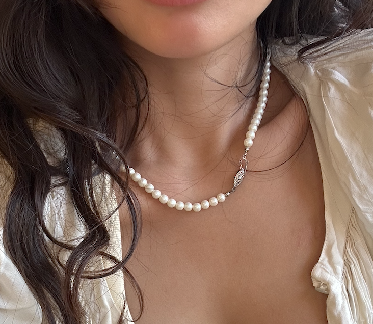 실버컬러 마감이 앤틱해 더욱 매력적인 프랑스에서 제작된 빈티지 진주 목걸이입니다. 클래식한 아이보리 톤의 펄이 일정하고 고르게 이어져 있어, 단정하고 우아한 분위기를 연출해 줍니다.