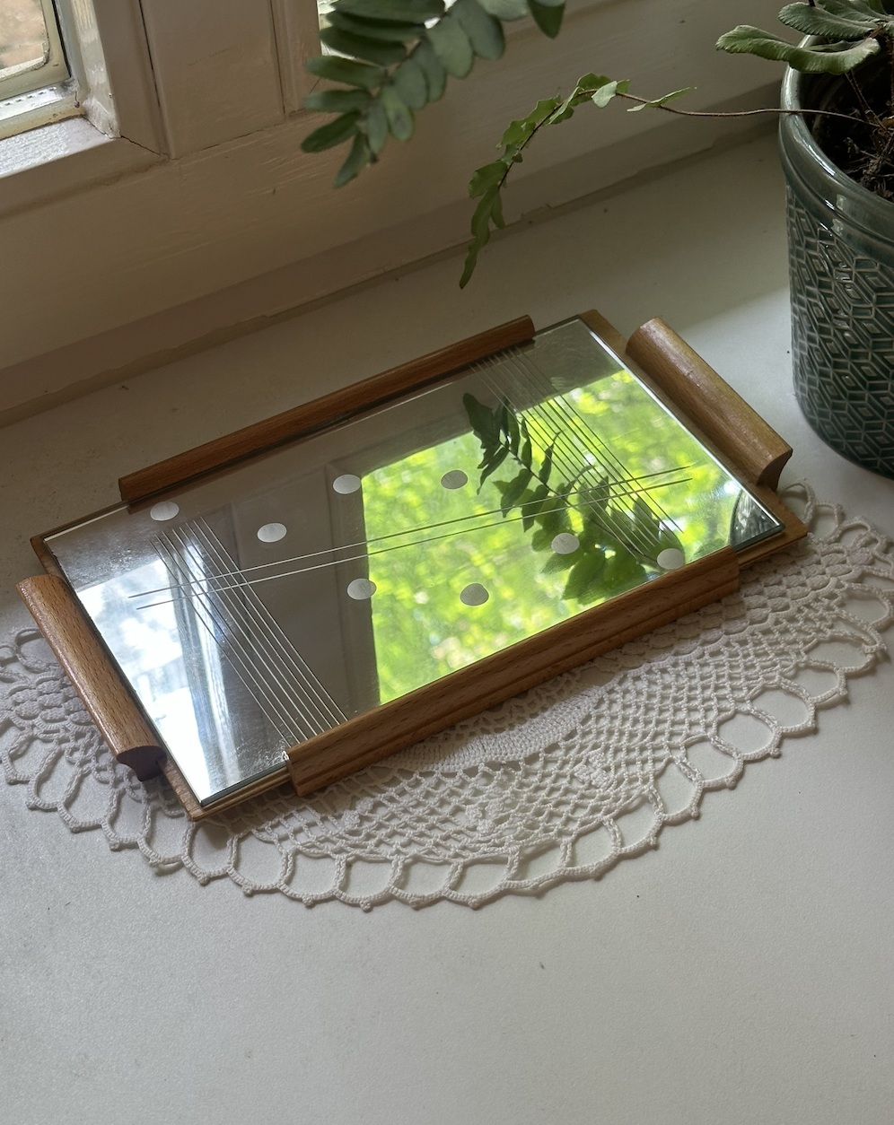 이 트레이는 1950~60년대 동독(일) - GDR 에서 제작된 우드 프레임 거울 트레이로, 아르데코와 미드센추리 디자인 요소가 조화롭게 어우러진 빈티지 소품입니다. 직사각형 형태의 거울 위에는