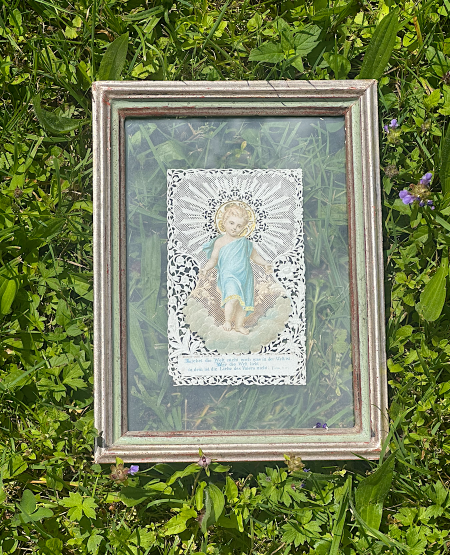이 작품은 예수 아기의 모습을 담은 19세기 말~20세기 초 유럽 제작의 Santino Merlettato Canivet 스타일의 성화 카드 프레임 입니다. 특히 이 작품은 부드럽고 평화로운 민트색의 섬세한 프레임과, 투명하고 맑은 광택을 머금은 배경 디테일이 돋보이는 매우 아름다운 카드로, 빛에 비추었을 때 드러나는 섬세한 감촉과 빛의 투과감이 특징입니다. 카드 전체는 ‘Canivet’ 기법으로 만들어졌으며, 이는 작은 가위나 칼을 이용해 섬세하게 레이스처럼 오려낸 종이 공예 스타일로, 주로 1800년대 중반에서 1900년대 초 프랑스와 독일 등 유럽 가톨릭 문화권에서 제작되었습니다. 뒷면에 고리가 있어 벽에 걸어 장식하실 수 있습니다.